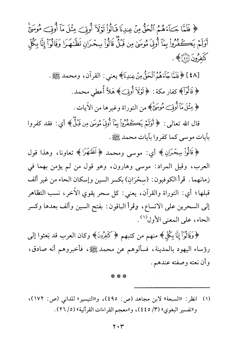قال الله تعالى: {أَوَلَمْ يَكْفُرُوا بِمَا أُوتِيَ مُوسَى مِنْ قَبْلُ} أي: فقد كفروا بآيات موسى كما كفروا بآيات محمد - صلى الله عليه وسلم -.