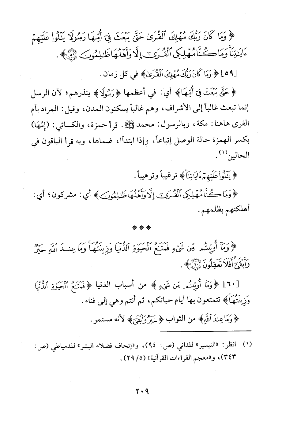 {حَتَّى يَبْعَثَ فِي أُمِّهَا} أي: في أعظمها {رَسُولًا} ينذرهم؛ لأن الرسل إنما تبعث غالبًا إلى الأشراف، وهم غالبًا يسكنون المدن، وقيل: المراد بأم القرى هاهنا: مكة، وبالرسول: محمد - صلى الله عليه وسلم -. قرأ حمزة، والكسائي: (إِمِّهَا) بكسر الهمزة حالة الوصل إتباعًا، وإذا ابتدأا، ضماها، وبه قرأ الباقون في الحالين (¬1).