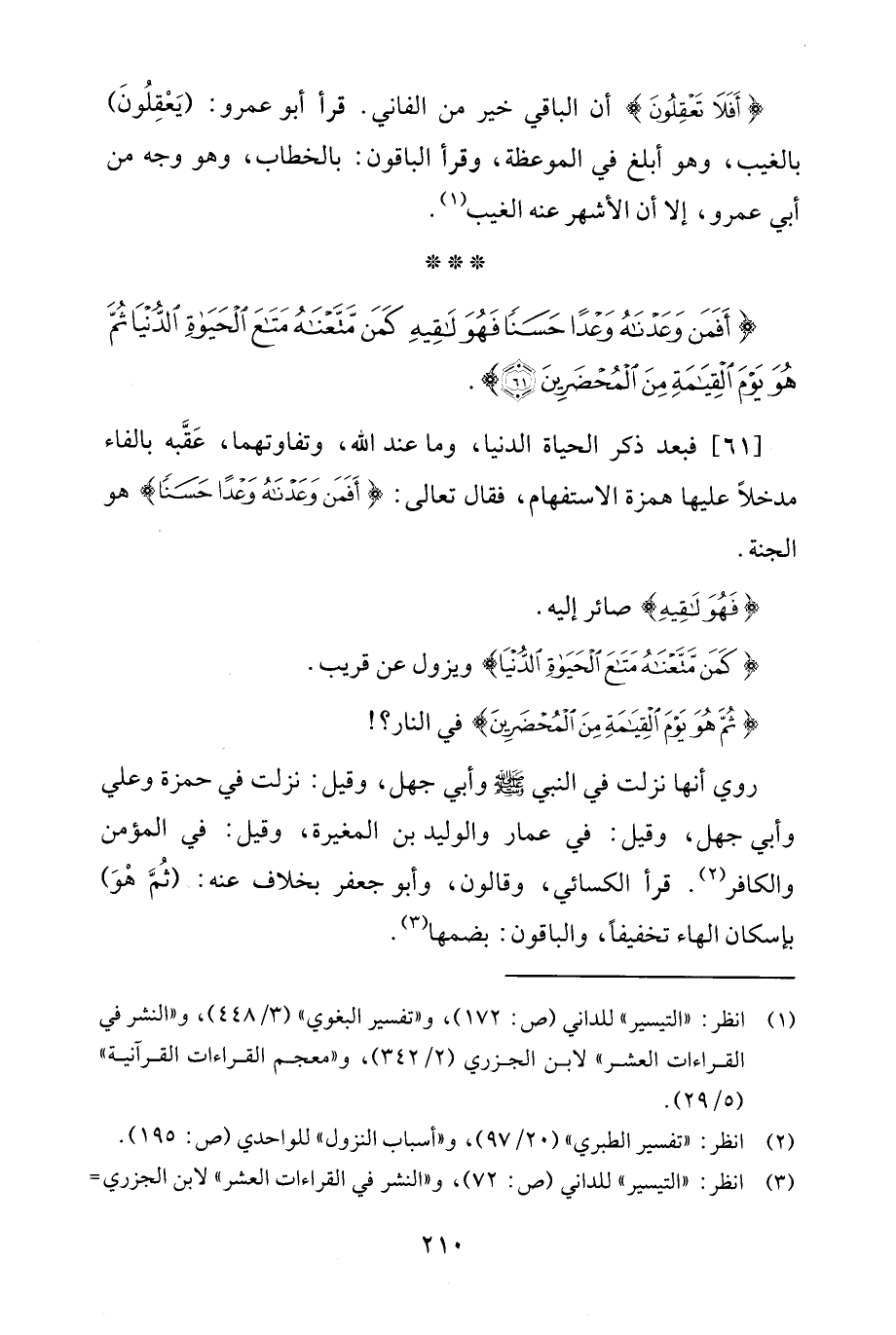{أَفَمَنْ وَعَدْنَاهُ وَعْدًا حَسَنًا فَهُوَ لَاقِيهِ كَمَنْ مَتَّعْنَاهُ مَتَاعَ الْحَيَاةِ الدُّنْيَا ثُمَّ هُوَ يَوْمَ الْقِيَامَةِ مِنَ الْمُحْضَرِينَ (61)}.