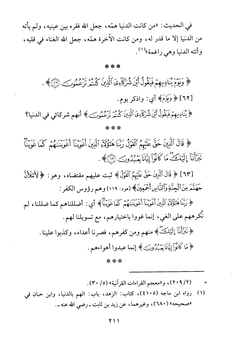 {وَيَوْمَ يُنَادِيهِمْ فَيَقُولُ أَيْنَ شُرَكَائِيَ الَّذِينَ كُنْتُمْ تَزْعُمُونَ (62)}.