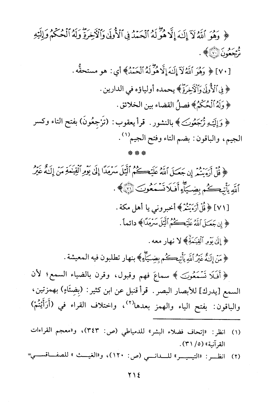 {قُلْ أَرَأَيْتُمْ إِنْ جَعَلَ اللَّهُ عَلَيْكُمُ اللَّيْلَ سَرْمَدًا إِلَى يَوْمِ الْقِيَامَةِ مَنْ إِلَهٌ غَيْرُ اللَّهِ يَأْتِيكُمْ بِضِيَاءٍ أَفَلَا تَسْمَعُونَ (71)}.