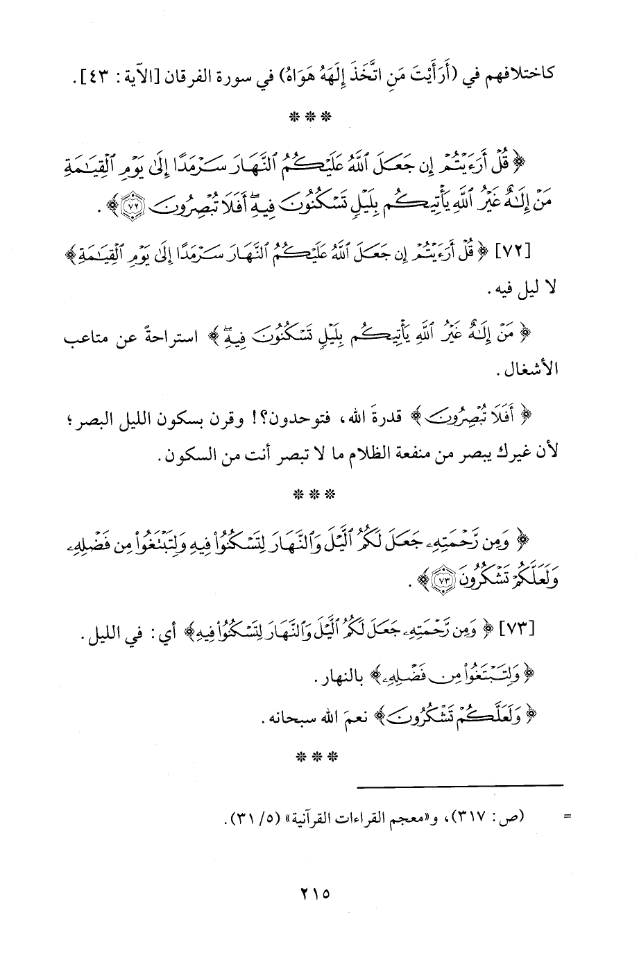 {وَمِنْ رَحْمَتِهِ جَعَلَ لَكُمُ اللَّيْلَ وَالنَّهَارَ لِتَسْكُنُوا فِيهِ وَلِتَبْتَغُوا مِنْ فَضْلِهِ وَلَعَلَّكُمْ تَشْكُرُونَ (73)}.