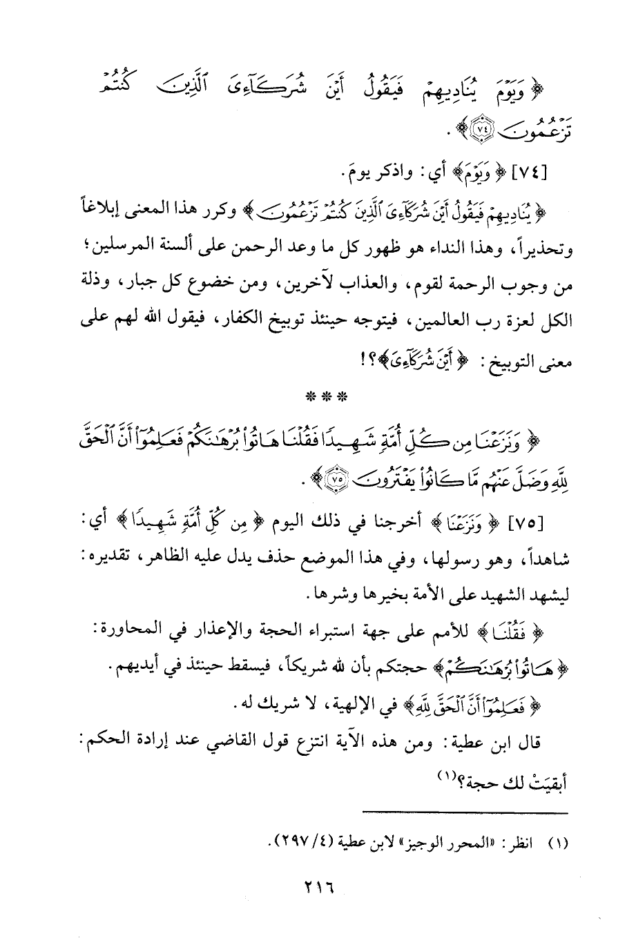 {وَنَزَعْنَا مِنْ كُلِّ أُمَّةٍ شَهِيدًا فَقُلْنَا هَاتُوا بُرْهَانَكُمْ فَعَلِمُوا أَنَّ الْحَقَّ لِلَّهِ وَضَلَّ عَنْهُمْ مَا كَانُوا يَفْتَرُونَ (75)}.