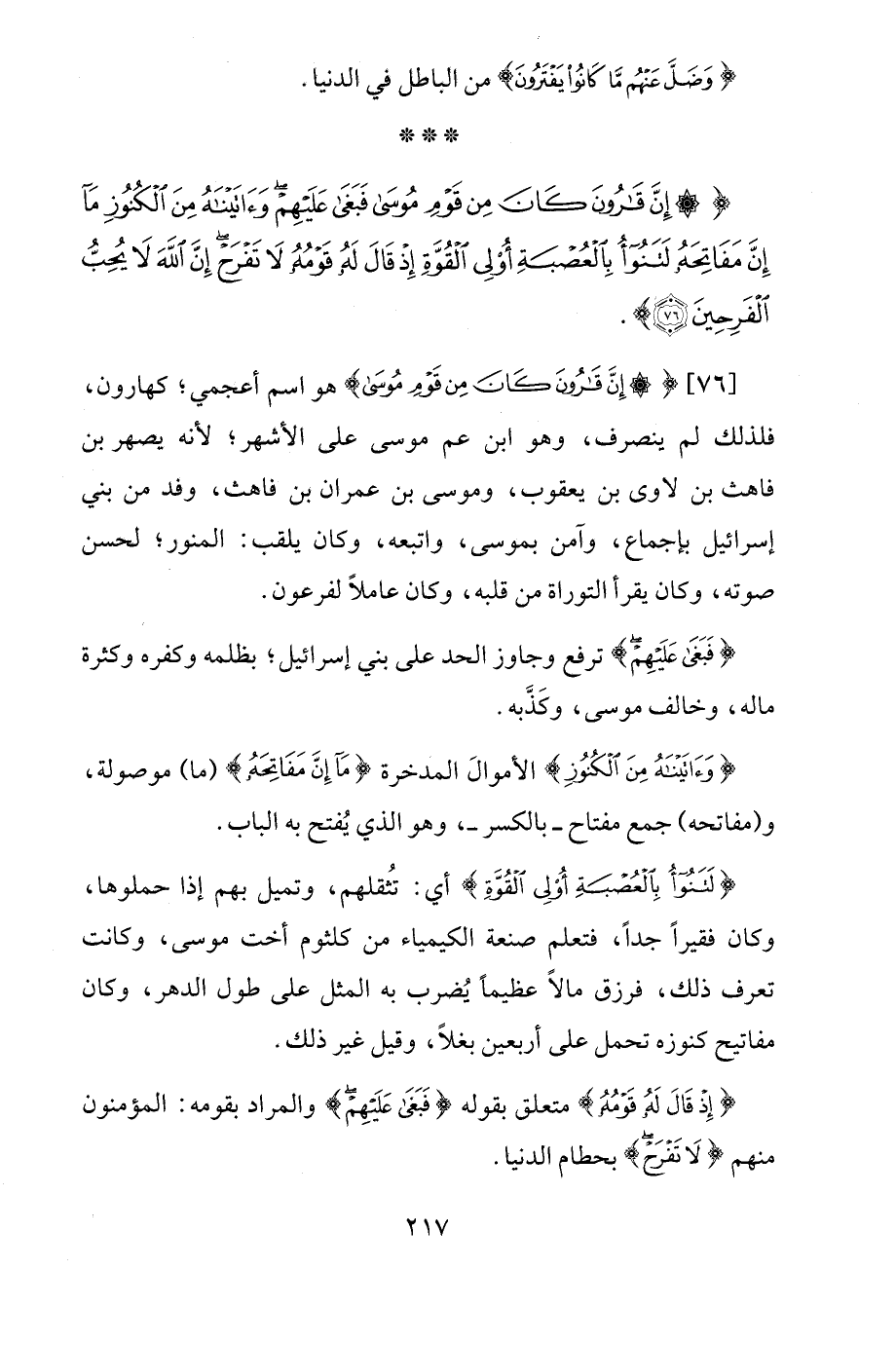 [76] {إِنَّ قَارُونَ كَانَ مِنْ قَوْمِ مُوسَى} هو اسم أعجمي؛ كهارون، فلذلك لم ينصرف، وهو ابن عم موسى على الأشهر؛ لأنه يصهر بن فاهث بن لاوى بن يعقوب، وموسى بن عمران بن فاهث، وفد من بني إسرائيل بإجماع، وآمن بموسى، واتبعه، وكان يلقب: المنور؛ لحسن صوته، وكان يقرأ التوراة من قلبه، وكان عاملًا لفرعون.