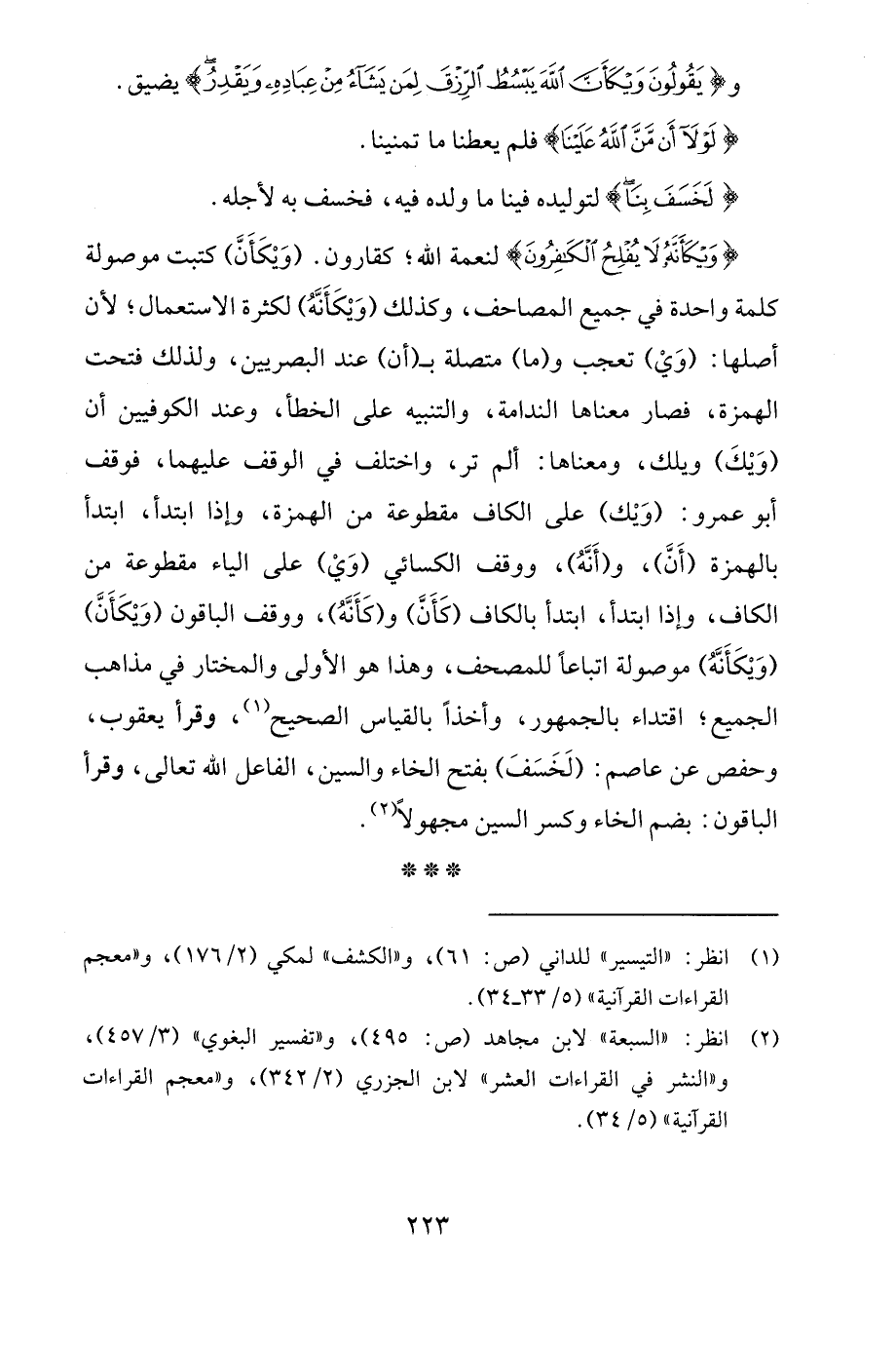 {وَيْكَأَنَّهُ لَا يُفْلِحُ الْكَافِرُونَ} لنعمة الله؛ كقارون. (وَيْكَأَنَّ) كتبت موصولة كلمة واحدة في جميع المصاحف، وكذلك (وَيْكَأَنَّهُ) لكثرة الاستعمال، لأن أصلها: (وَيْ) تعجب و (ما) متصلة بـ (أن) عند البصريين، ولذلك فتحت الهمزة، فصار معناها الندامة، والتنبيه على الخطأ، وعند الكوفيين أن (وَيْكَ) ويلك، ومعناها: ألم تر، واختلف في الوقف عليهما، فوقف أبو عمرو: (وَيْك) على الكاف مقطوعة من الهمزة، وإذا ابتدأ، ابتدأ بالهمزة (أَنَّ)، و (أَنَّهُ)، ووقف الكسائي (وَيْ) على الياء مقطوعة من الكاف، وإذا ابتدأ، ابتدأ بالكاف (كَأَنَّ) و (كَأَنَّهُ)، ووقف الباقون (وَيْكَأَنَّ) (وَيْكَأَنَّهُ) موصولة اتباعًا للمصحف، وهذا هو الأولى والمختار في مذاهب الجميع؛ اقتداء بالجمهور، وأخذًا بالقياس الصحيح (¬1)، وقرأ يعقوب، وحفص عن عاصم: (لَخَسَفَ) بفتح الخاء والسين، الفاعل الله تعالى، وقرأ الباقون: بضم الخاء وكسر السين مجهولًا (¬2).