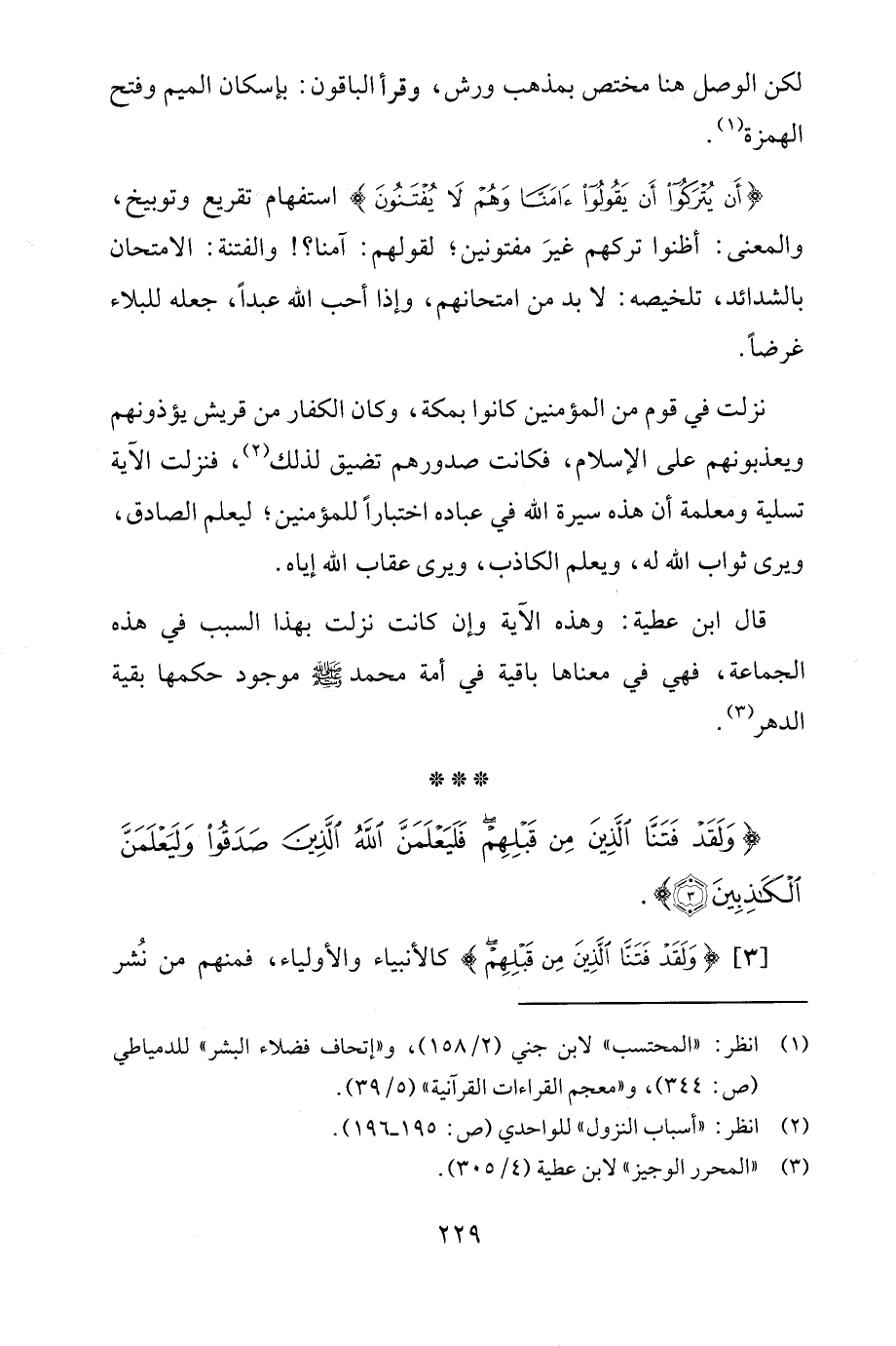 {أَنْ يُتْرَكُوا أَنْ يَقُولُوا آمَنَّا وَهُمْ لَا يُفْتَنُونَ} استفهام تقريع وتوبيخ، والمعنى: أظنوا تركهم غيرَ مفتونين؛ لقولهم: آمنا؟! والفتنة: الامتحان بالشدائد، تلخيصه: لا بد من امتحانهم، وإذا أحب الله عبدًا، جعله للبلاء غرضًا.