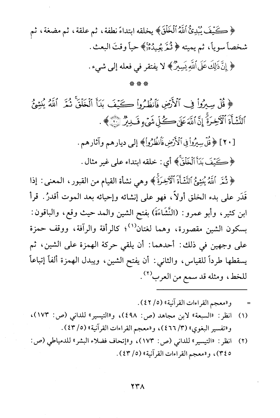 {ثُمَّ اللَّهُ يُنْشِئُ النَّشْأَةَ الْآخِرَةَ} وهي نشأة القيام من القبور، المعنى: إذا قَدَر على بدء الخلق أولًا، فهو على إنشائه وإحيائه بعد الموت أقدرُ. قرأ ابن كثير، وأبو عمرو: (النَّشَاءَةَ) بفتح الشين والمد حيث وقع، والباقون: بسكون الشين مقصورة، وهما لغتان (¬1)؛ كالرأفة والرآفة، ووقف حمزة على وجهين في ذلك: أحدهما: أن يلقي حركة الهمزة على الشين، ثم يسقطها طردًا للقياس، والثاني: أن يفتح الشين، ويبدل الهمزة ألفًا إتباعًا للخط، ومثله قد سمع من العرب (¬2).