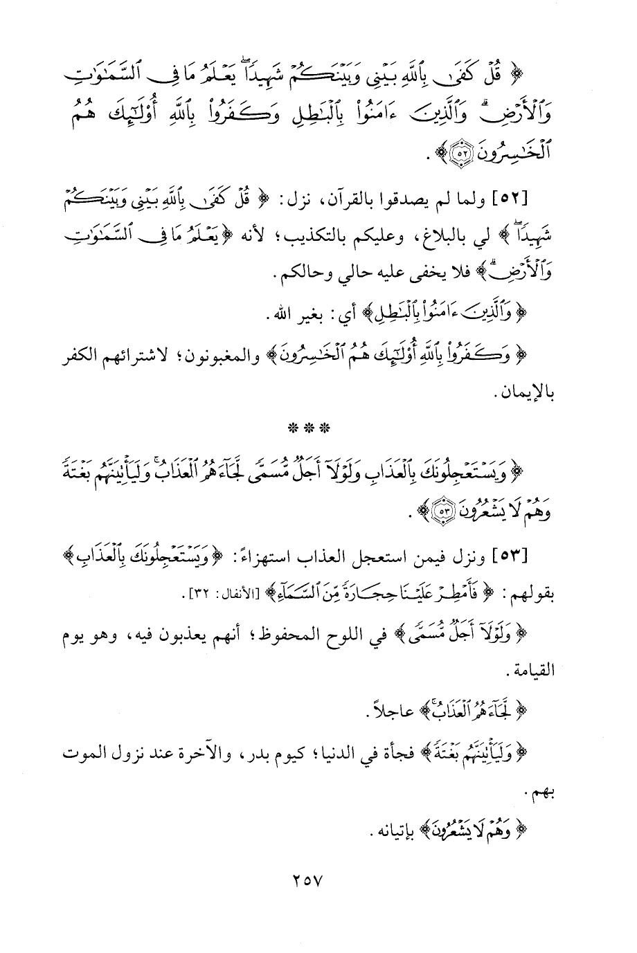 {قُلْ كَفَى بِاللَّهِ بَيْنِي وَبَيْنَكُمْ شَهِيدًا يَعْلَمُ مَا فِي السَّمَاوَاتِ وَالْأَرْضِ وَالَّذِينَ آمَنُوا بِالْبَاطِلِ وَكَفَرُوا بِاللَّهِ أُولَئِكَ هُمُ الْخَاسِرُونَ (52)}.