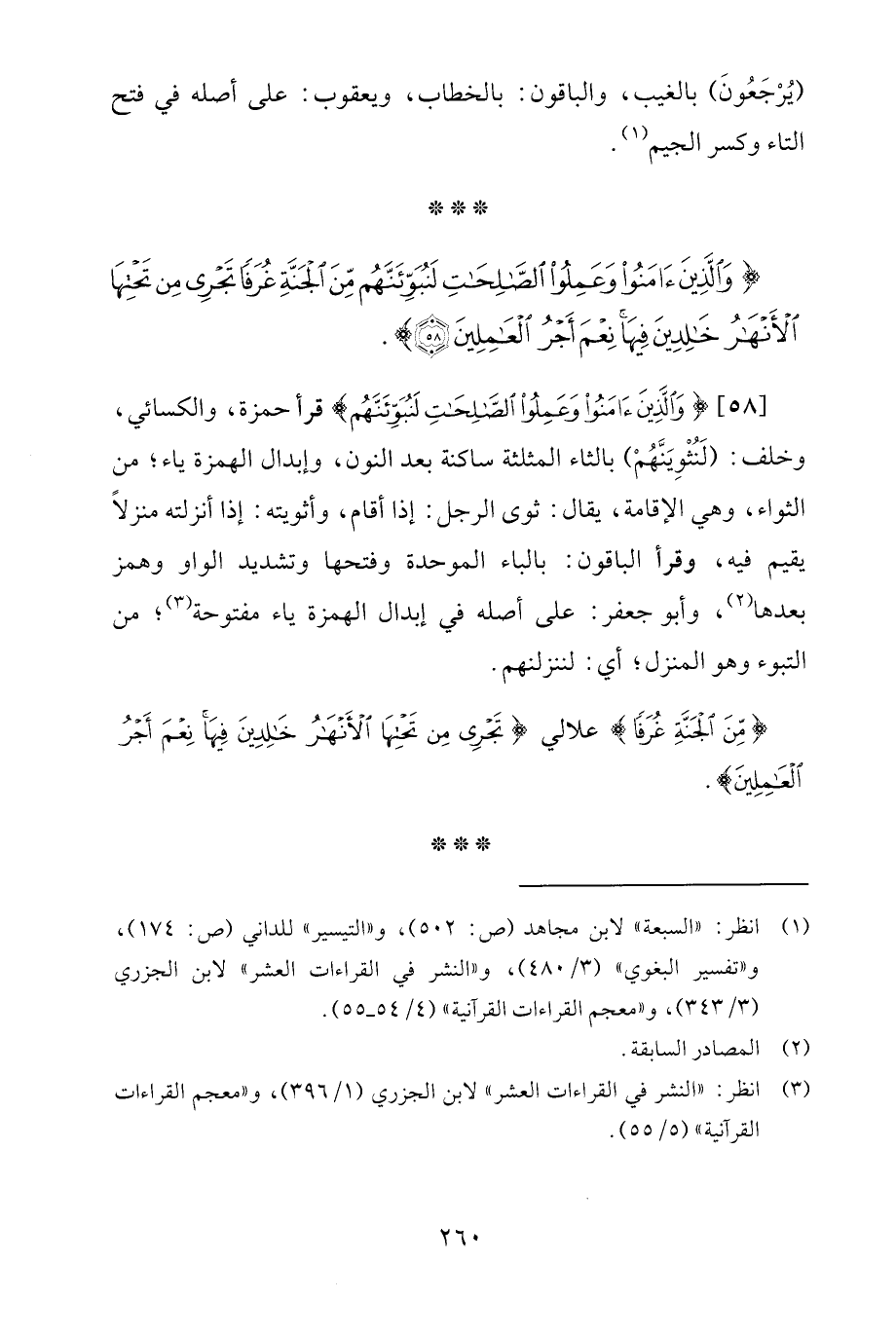 [58] {وَالَّذِينَ آمَنُوا وَعَمِلُوا الصَّالِحَاتِ لَنُبَوِّئَنَّهُمْ} قرأ حمزة، والكسائي، وخلف: (لَنُثْوِيَنَّهُمْ) بالثاء المثلثة ساكنة بعد النون، وإبدال الهمزة ياء؛ من الثواء، وهي الإقامة، يقال: ثوى الرجل: إذا أقام، وأثويته: إذا أنزلته منزلًا يقيم فيه، وقرأ الباقون: بالباء الموحدة وفتحها وتشديد الواو وهمز بعدها (¬2)، وأبو جعفر: على أصله في إبدال الهمزة ياء مفتوحة (¬3)؛ من التبوء وهو المنزل، أي: لننزلنهم.
