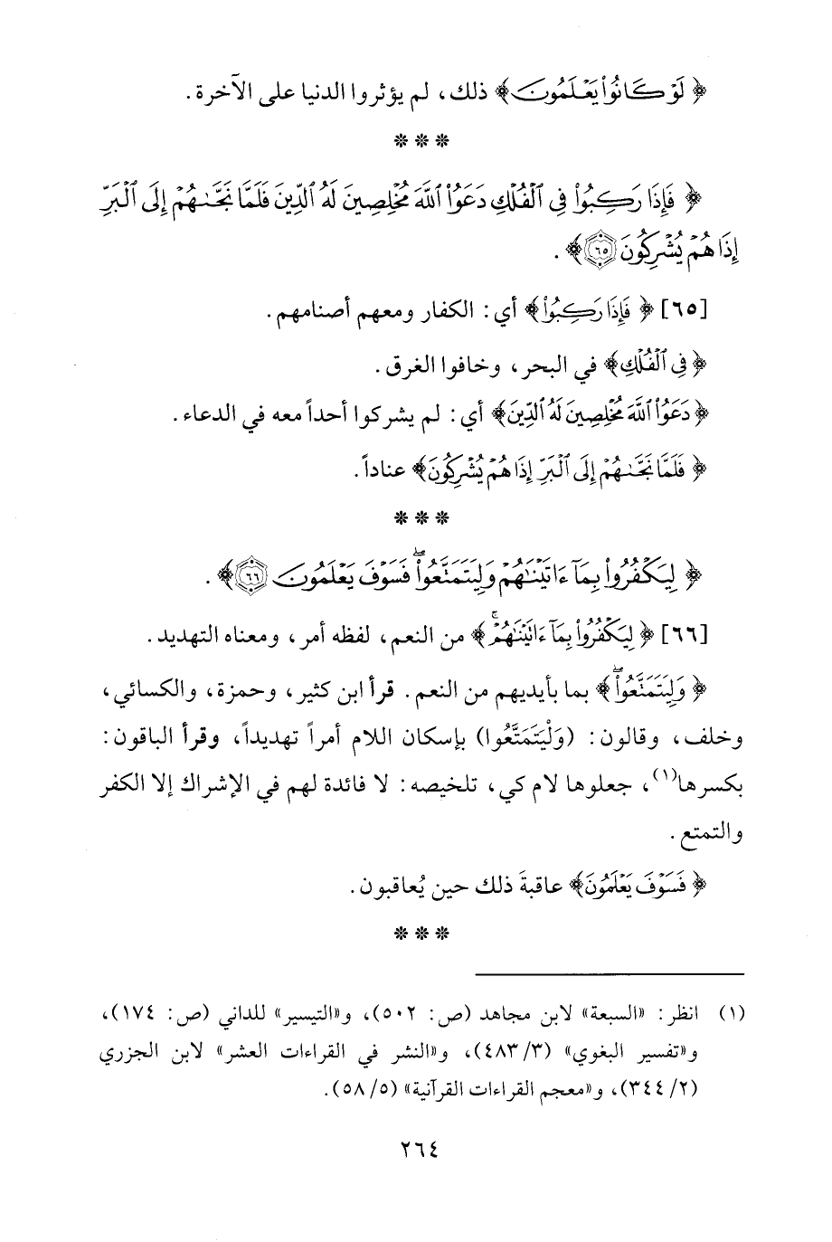 {وَلِيَتَمَتَّعُوا} بما بأيديهم من النعم. قرأ ابن كثير، وحمزة، والكسائي، وخلف، وقالون: (وَلْيَتَمَتَّعُوا) بإسكان اللام أمرًا تهديدًا، وقرأ الباقون: بكسرها (¬1)، جعلوها لام كي، تلخيصه: لا فائدة لهم في الإشراك إلا الكفر والتمتع.