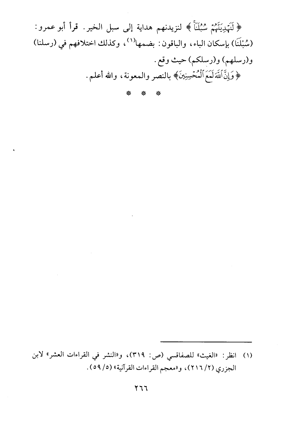 {لَنَهْدِيَنَّهُمْ سُبُلَنَا} لنزيدنهم هداية إلى سبل الخير. قرأ أبو عمرو: (سُبْلَنَا) بإسكان الباء، والباقون: بضمها (¬1)، وكذلك اختلافهم في (رسلنا) و (رسلهم) و (رسلكم) حيث وقع.