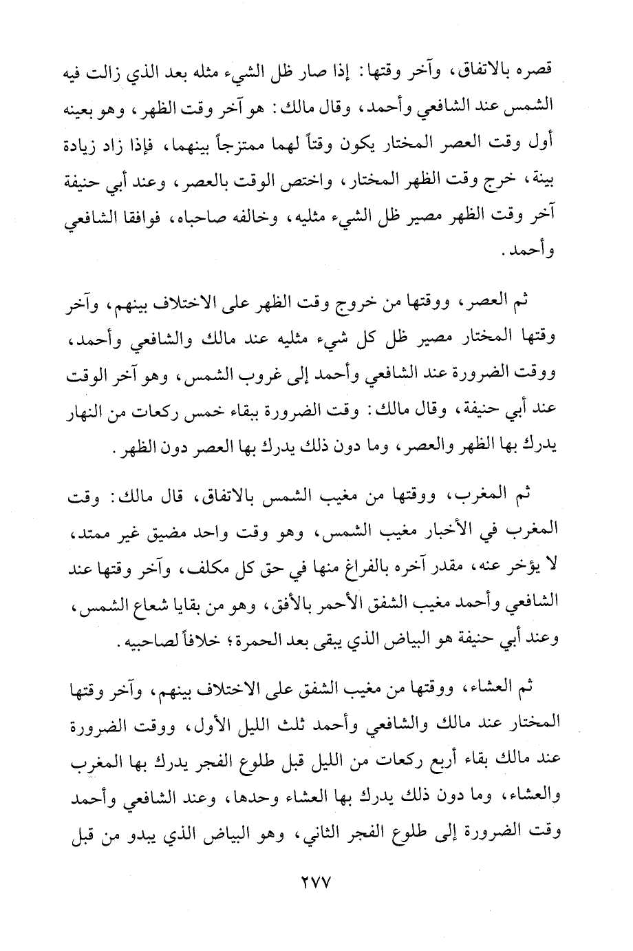 ثم العشاء، ووقتها من مغيب الشفق على الاختلاف بينهم، وآخر وقتها المختار عند مالك والشافعي وأحمد ثلث الليل الأول، ووقت الضرورة عند مالك بقاء أربع ركعات من الليل قبل طلوع الفجر يدرك ما المغرب والعشاء، وما دون ذلك يدرك بها العشاء وحدها، وعند الشافعي وأحمد وقت الضرورة إلى طلوع الفجر الثاني، وهو البياض الذي يبدو من قبل