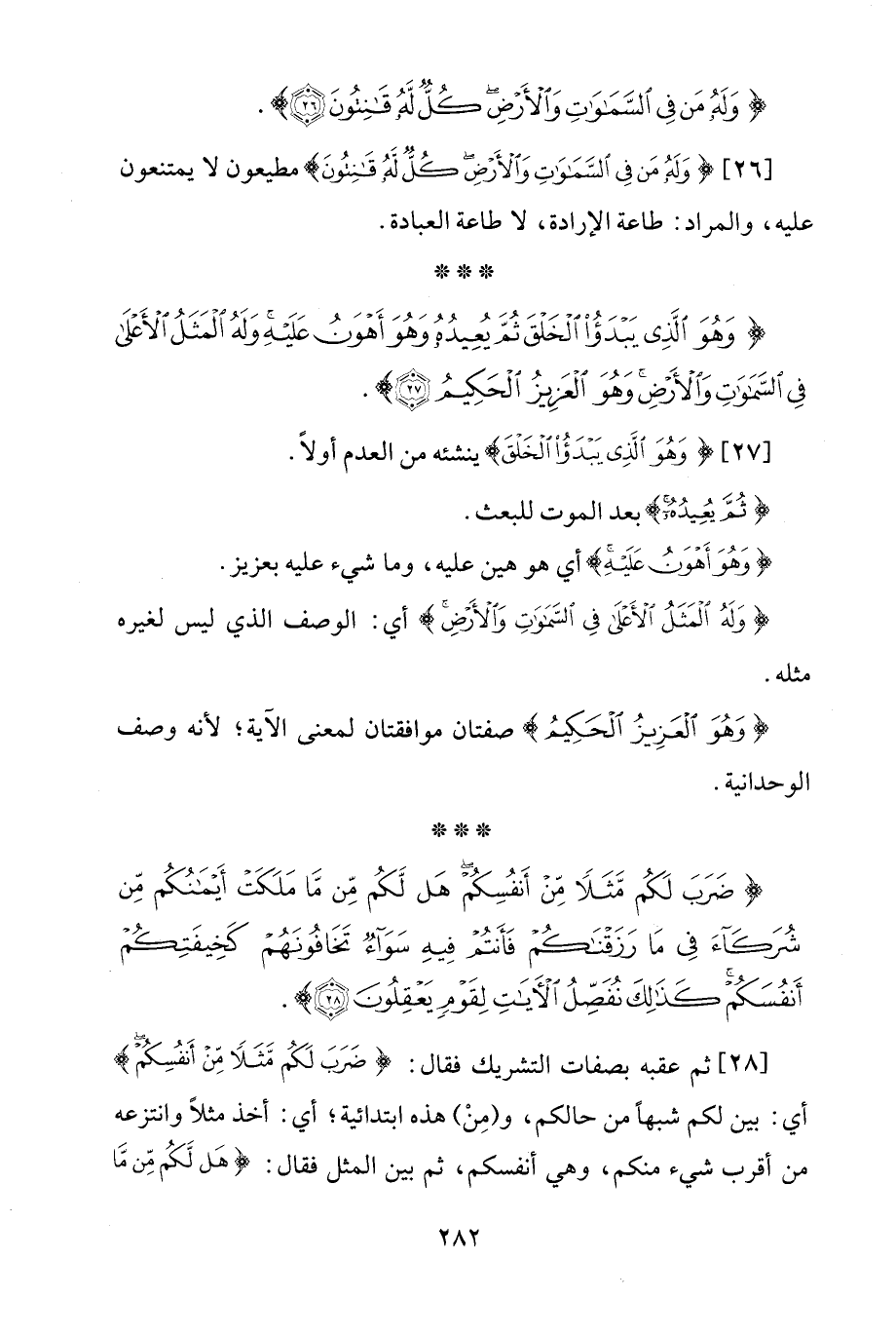 [28] ثم عقبه بصفات التشريك فقال: {ضَرَبَ لَكُمْ مَثَلًا مِنْ أَنْفُسِكُمْ} أي: بين لكم شبهًا من حالكم، و (مِنْ) هذه ابتدائية؛ أي: أخذ مثلًا وانتزعه من أقرب شيء منكم، وهي أنفسكم، ثم بين المثل فقال: {هَلْ لَكُمْ مِنْ مَا