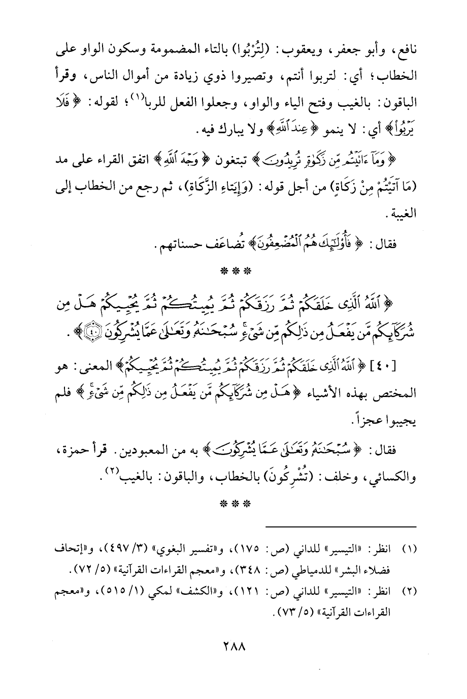 نافع، وأبو جعفر، ويعقوب: (لِتُرْبُوا) بالتاء المضمومة وسكون الواو على الخطاب؛ أي: لتربوا أنتم، وتصيروا ذوي زيادة من أموال الناس، وقرأ الباقون: بالغيب وفتح الياء والواو، وجعلوا الفعل للربا (¬1)؛ لقوله: {فَلَا يَرْبُو} أي: لا ينمو {عِنْدَ اللَّهِ} ولا يبارك فيه.