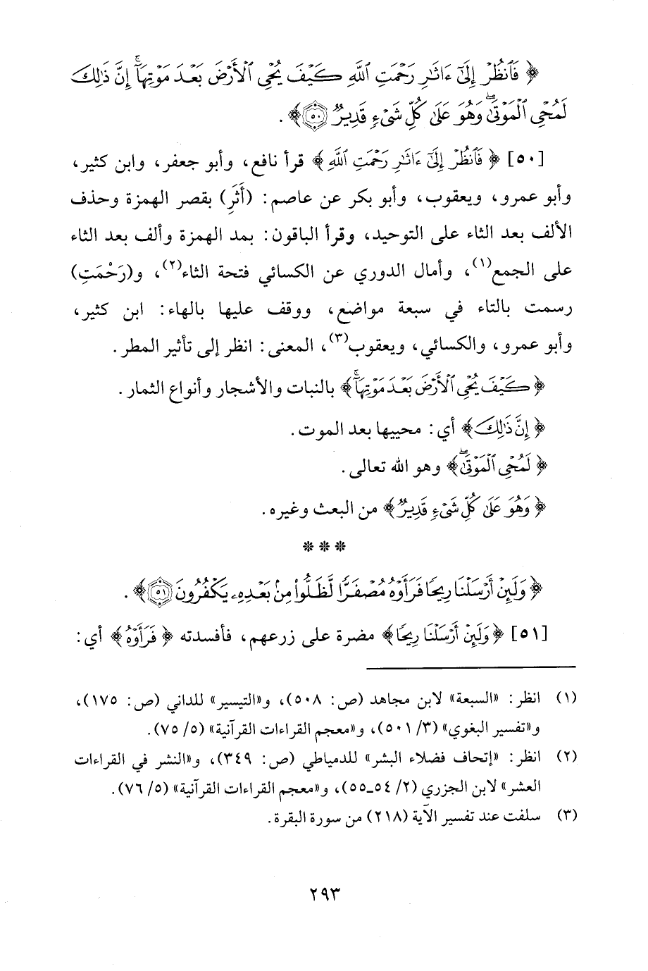 [50] {فَانْظُرْ إِلَى آثَارِ رَحْمَتِ اللَّهِ} قرأ نافع، وأبو جعفر، وابن كثير، وأبو عمرو، ويعقوب، وأبو بكر عن عاصم: (أَثَرِ) بقصر الهمزة وحذف الألف بعد الثاء على التوحيد، وقرأ الباقون: بمد الهمزة وألف بعد الثاء على الجمع (¬1)، وأمال الدوري عن الكسائي فتحة الثاء (¬2)، و (رَحْمَتِ) رسمت بالتاء في سبعة مواضع، ووقف عليها بالهاء: ابن كثير، وأبو عمرو، والكسائي، ويعقوب (¬3)، المعنى: انظر إلى تأثير المطر.