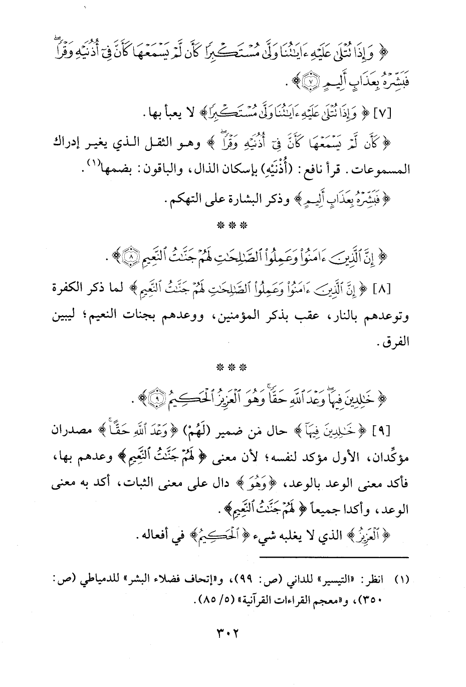[9] {خَالِدِينَ فِيهَا} حال من ضمير (لَهُمْ) {وَعْدَ اللَّهِ حَقًّا} مصدران مؤكِّدان، الأول مؤكد لنفسه؛ لأن معنى {لَهُمْ جَنَّاتُ النَّعِيمِ} وعدهم بها، فأكد معنى الوعد بالوعد، {وَهُوَ} دال على معنى الثبات، أكد به معنى الوعد، وأكدا جميعًا {لَهُمْ جَنَّاتُ النَّعِيمِ}.