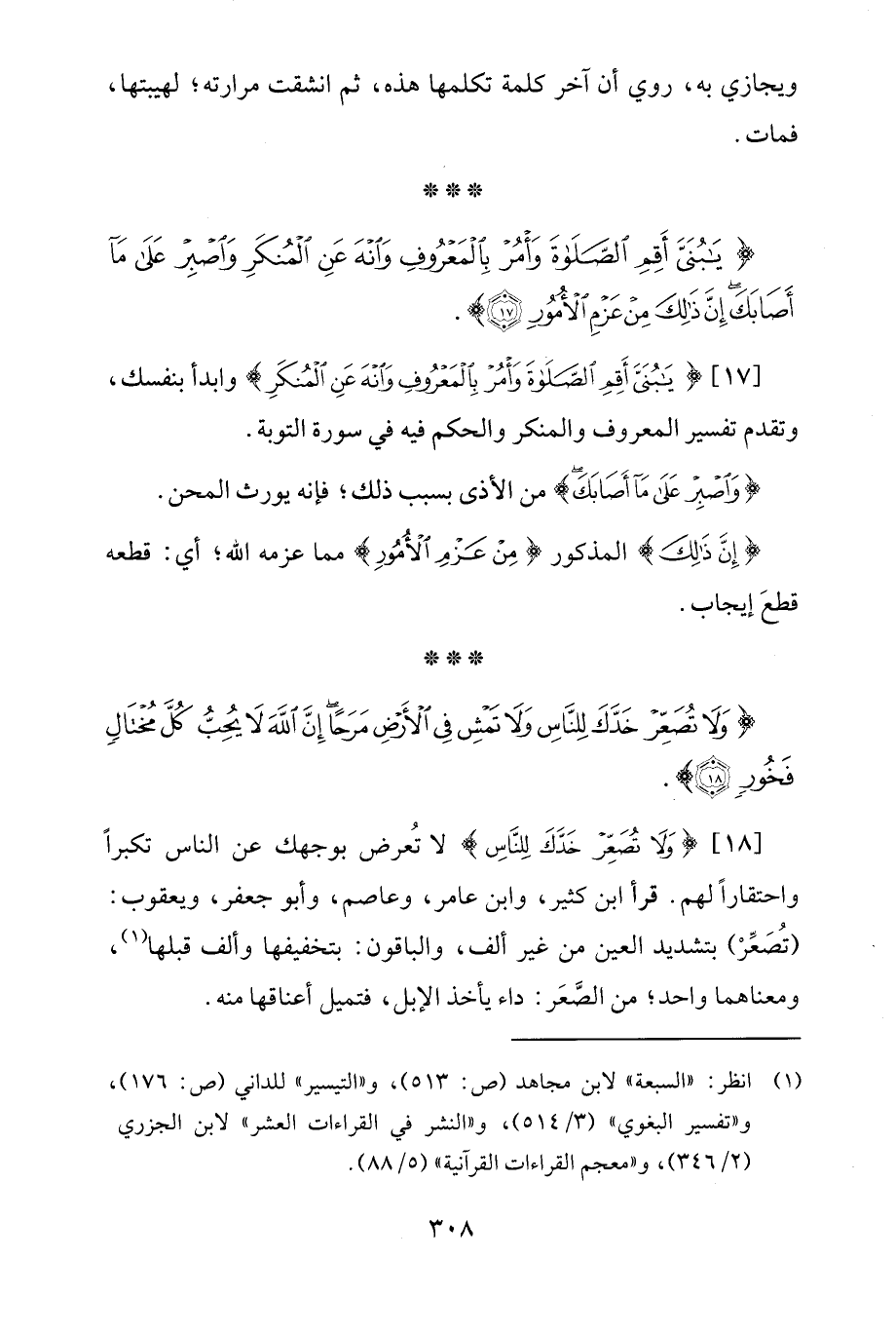 [18] {وَلَا تُصَعِّرْ خَدَّكَ لِلنَّاسِ} لا تُعرض بوجهك عن الناس تكبرًا واحتقارًا لهم. قرأ ابن كثير، وابن عامر، وعاصم، وأبو جعفر، ويعقوب: (تُصَعِّرْ) بتشديد العين من غير ألف، والباقون: بتخفيفها وألف قبلها (¬1)، ومعناهما واحد؛ من الصَّعَر: داء يأخذ الإبل، فتميل أعناقها منه.