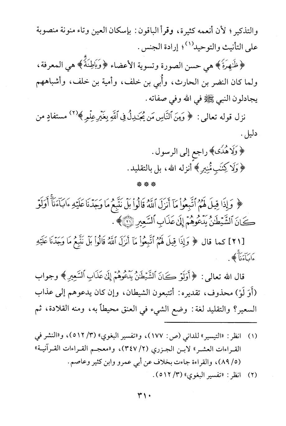 قال الله تعالى: {أَوَلَوْ كَانَ الشَّيْطَانُ يَدْعُوهُمْ إِلَى عَذَابِ السَّعِيرِ} وجواب (أَوَ لَوْ) محذوف، تقديره: أتتبعون الشيطان، وإن كان يدعوهم إلى عذاب السعير؟ والتقليد لغة: وضع الشيء في العنق محيطًا به، ومنه القلادة، ثم