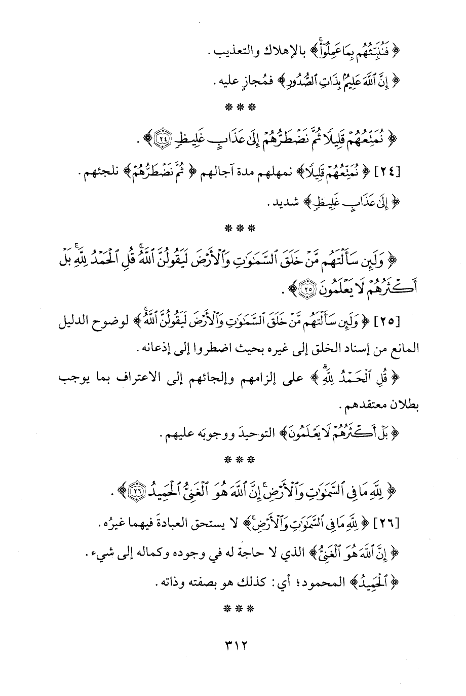 [25] {وَلَئِنْ سَأَلْتَهُمْ مَنْ خَلَقَ السَّمَاوَاتِ وَالْأَرْضَ لَيَقُولُنَّ اللَّهُ} لوضوح الدليل المانع من إسناد الخلق إلى غيره بحيث اضطروا إلى إذعانه.
