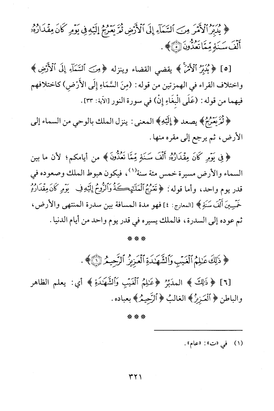 [5] {يُدَبِّرُ الْأَمْرَ} يقضي القضاء وينزله {مِنَ السَّمَاءِ إِلَى الْأَرْضِ} واختلاف القراء في الهمزتين من قوله: (مِنَ السَّمَاءِ إِلَى الأَرْضِ) كاختلافهم فيهما من قوله: (عَلَى الْبِغَاءِ إِنْ) في سورة النور [الآية: 33].