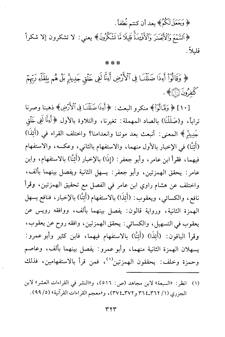 [10] {وَقَالُوا} منكرو البعث: {أَإِذَا ضَلَلْنَا فِي الْأَرْضِ} ذهبنا وصرنا ترابًا، و (صَلَلْنَا) بالصاد المهملة: تغيرنا، والتلاوة بالأول {أَإِنَّا لَفِي خَلْقٍ جَدِيدٍ} المعنى: أنبعث بعد موتنا وانعدامنا؟ واختلف القراء في (أَئِذَا) (أَئِنَّا) في الإخبار بالأول منهما، والاستفهام بالثاني، وعكسه، والاستفهام فيهما، فقرأ ابن عامر، وأبو جعفر: (إِذَا) بالإخبار (أَئِنَّا) بالاستفهام، وابن عامر: يحقق الهمزتين، وأبو جعفر: يسهل الثانية ويفصل بينهما بألف، واختلف عن هشام راوي ابن عامر في الفصل مع تحقيق الهمزتين، وقرأ نافع، والكسائي، ويعقوب: (أَئِذَا) بالاستفهام (أَئِنَّا) بالإخبار، فنافع يسهل الهمزة الثانية، ورواية قالون: يفصل بينهما بألف، ووافقه رويس عن يعقوب في التسهيل، والكسائي: يحقق الهمزتين، وافقه روح عن يعقوب، وقرأ الباقون: (أَئِذَا) (أَئِنَّا) بالاستفهام فيهما، فابن كثير وأبو عمرو: يسهلان الهمزة الثانية منهما، وأبو عمرو: يفصل بينهما بألف، وعاصم وحمزة وخلف: يحققون الهمزتين (¬1)، فمن قرأ بالاستفهامين، فذلك