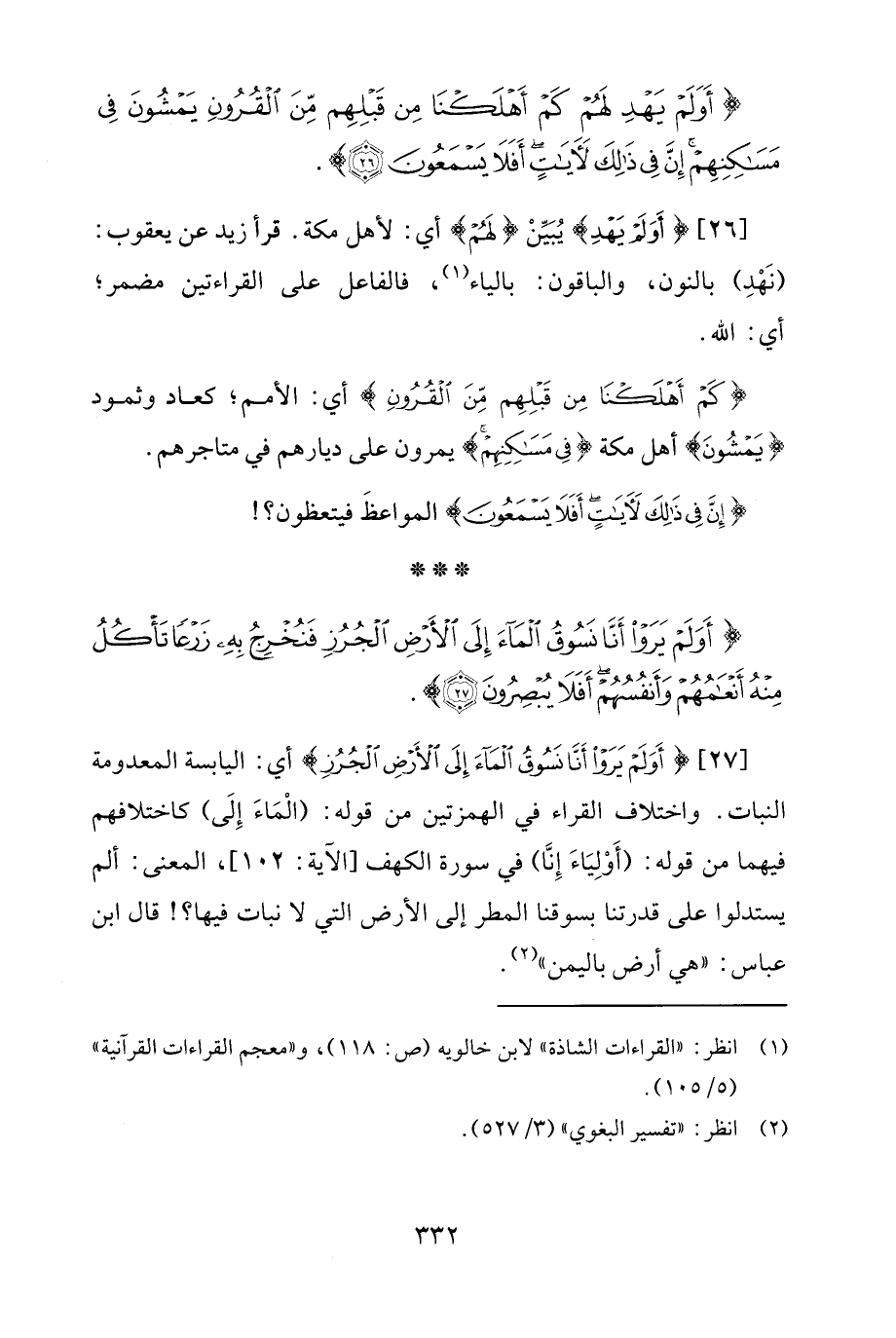 [26] {أَوَلَمْ يَهْدِ} يُبيِّنْ {لَهُمْ} أي: لأهل مكة. قرأ زيد عن يعقوب: (نَهْدِ) بالنون، والباقون: بالياء (¬1)، فالفاعل على القراءتين مضمر؛ أي: الله.
