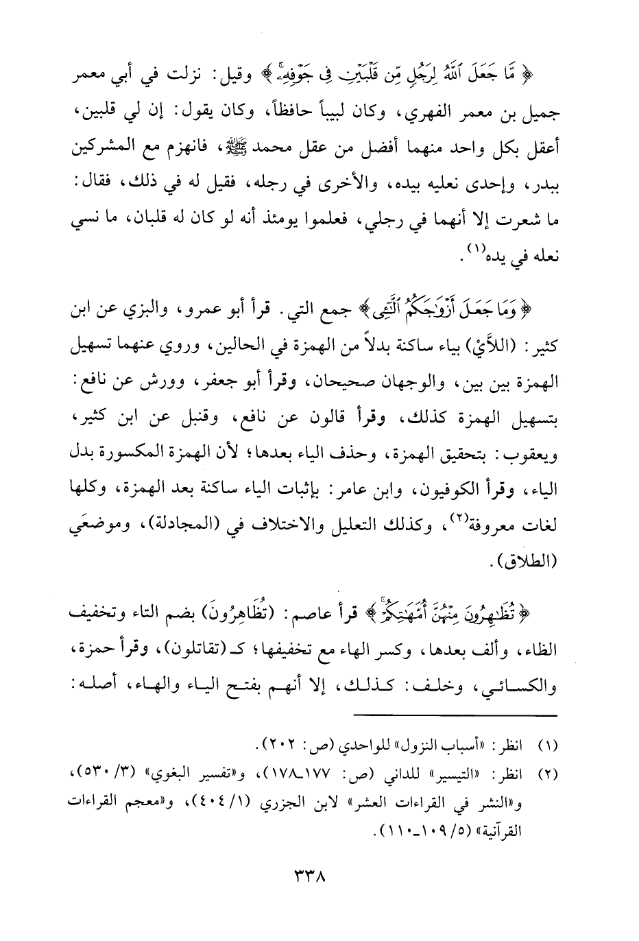 {مَا جَعَلَ اللَّهُ لِرَجُلٍ مِنْ قَلْبَيْنِ فِي جَوْفِهِ} وقيل: نزلت في أبي معمر جميل بن معمر الفهري، وكان لبيبًا حافظًا، وكان يقول: إن لي قلبين، أعقل بكل واحد منهما أفضل من عقل محمد - صلى الله عليه وسلم -، فانهزم مع المشركين ببدر، وإحدى نعليه بيده، والأخرى في رجله، فقيل له في ذلك، فقال: ما شعرت إلا أنهما في رجلي، فعلموا يومئذ أنه لو كان له قلبان، ما نسي نعله في يده (¬1).