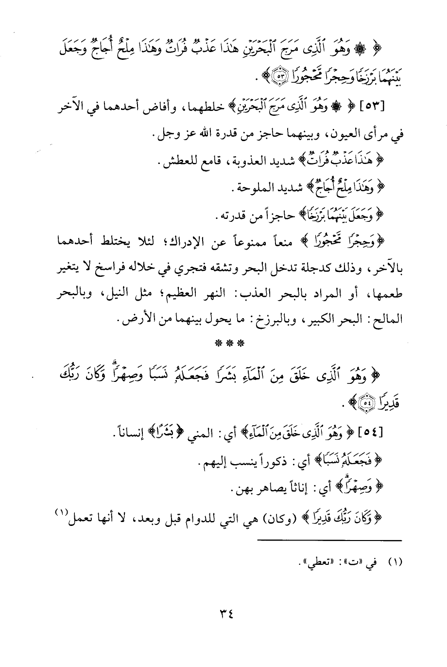 [53] {وَهُوَ الَّذِي مَرَجَ الْبَحْرَيْنِ} خلطهما، وأفاض أحدهما في الآخر في مرأى العيون، وبينهما حاجز من قدرة الله عز وجل.