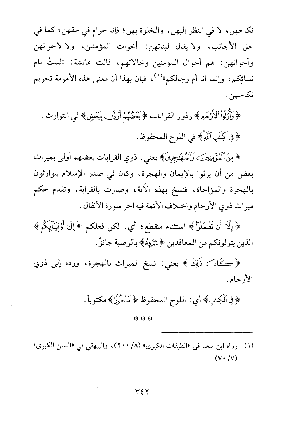 نكاحهن، لا في النظر إليهن، والخلوة بهن؛ فإنه حرام في حقهن؛ كما في حق الأجانب، ولا يقال لبناتهن: أخوات المؤمنين، ولا لإخوانهن وأخواتهن: هم أخوال المؤمنين وخالاتهم، قالت عائشة: "لستُ بأم نسائِكم، وإنما أنا أم رجالكم" (¬1)، فبان بهذا أن معنى هذه الأمومة تحريم نكاحهن.