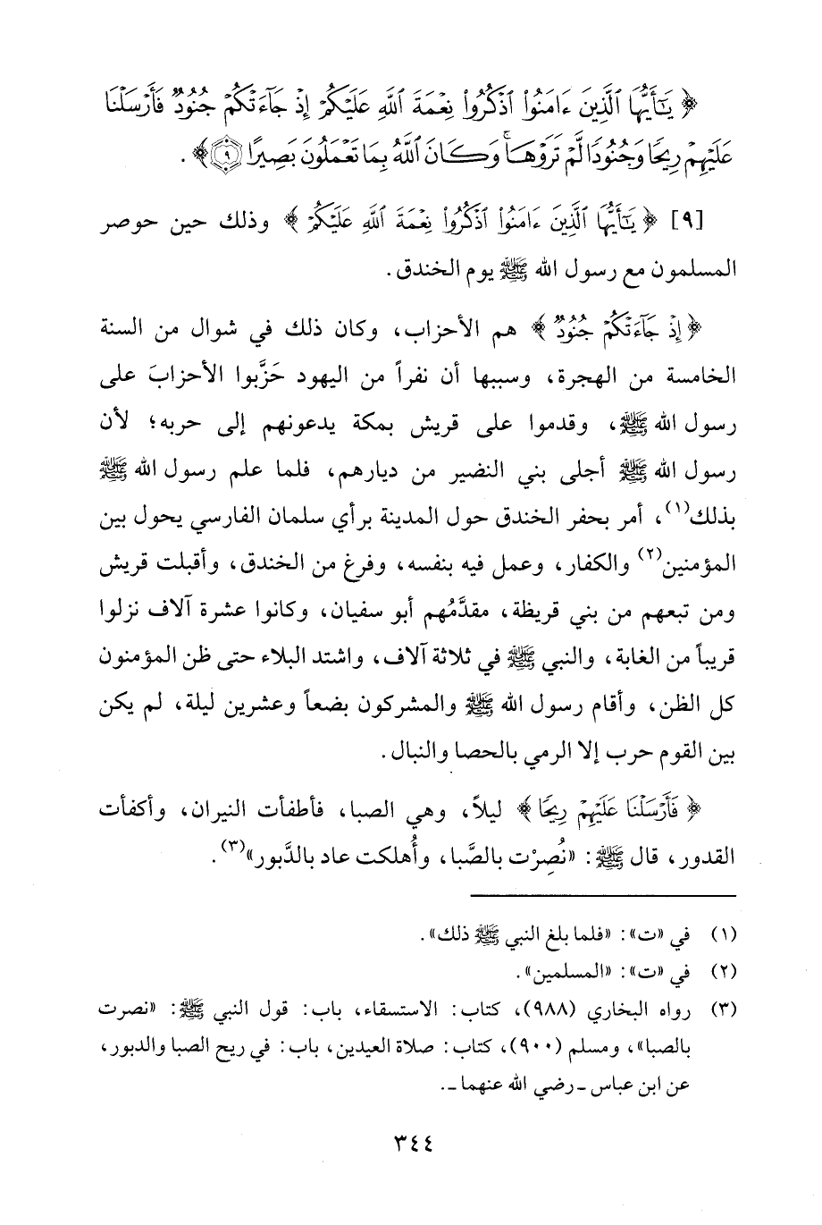 [9] {يَاأَيُّهَا الَّذِينَ آمَنُوا اذْكُرُوا نِعْمَةَ اللَّهِ عَلَيْكُمْ} وذلك حين حوصر المسلمون مع رسول الله - صلى الله عليه وسلم - يوم الخندق.