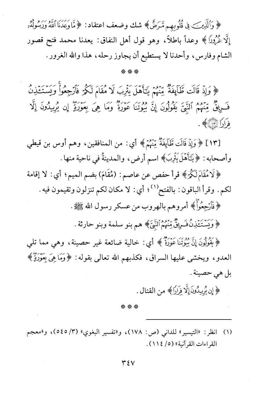 {وَإِذْ قَالَتْ طَائِفَةٌ مِنْهُمْ يَاأَهْلَ يَثْرِبَ لَا مُقَامَ لَكُمْ فَارْجِعُوا وَيَسْتَأْذِنُ فَرِيقٌ مِنْهُمُ النَّبِيَّ يَقُولُونَ إِنَّ بُيُوتَنَا عَوْرَةٌ وَمَا هِيَ بِعَوْرَةٍ إِنْ يُرِيدُونَ إِلَّا فِرَارًا (13)}.