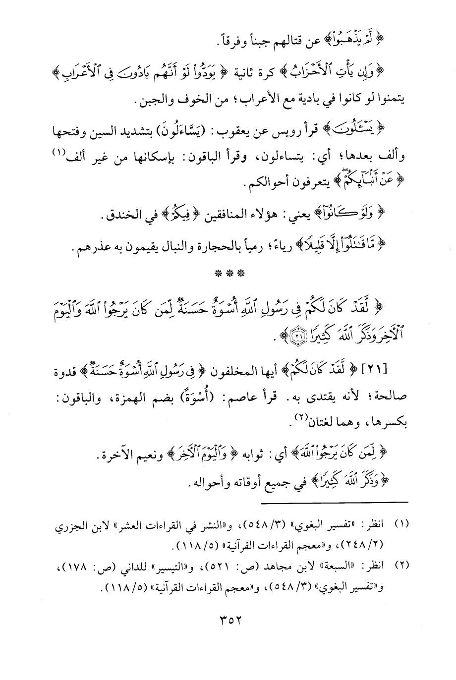 [21] {لَقَدْ كَانَ لَكُمْ} أيها المخلفون {فِي رَسُولِ اللَّهِ أُسْوَةٌ حَسَنَةٌ} قدوة صالحة؛ لأنه يقتدى به. قرأ عاصم: (أُسْوَةٌ) بضم الهمزة، والباقون: بكسرها، وهما لغتان (¬2).