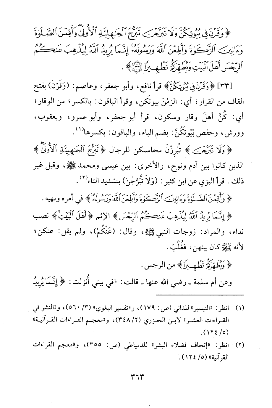 [33] {وَقَرْنَ فِي بُيُوتِكُنَّ} قرأ نافع، وأبو جعفر، وعاصم: (وَقَرْنَ) بفتح القاف من القرار؛ أي: الزمْنَ بيوتَكن، وقرأ الباقون: بالكسر؛ من الوقار؛ أي: كُنَّ أهلَ وقار وسكون، قرأ أبو جعفر، وأبو عمرو، ويعقوب، وورش، وحفص بُيُوتَكُنَّ: بضم الباء، والباقون: بكسرها (¬1).