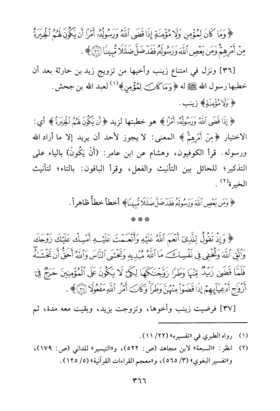 {وَمَا كَانَ لِمُؤْمِنٍ وَلَا مُؤْمِنَةٍ إِذَا قَضَى اللَّهُ وَرَسُولُهُ أَمْرًا أَنْ يَكُونَ لَهُمُ الْخِيَرَةُ مِنْ أَمْرِهِمْ وَمَنْ يَعْصِ اللَّهَ وَرَسُولَهُ فَقَدْ ضَلَّ ضَلَالًا مُبِينًا (36)}.