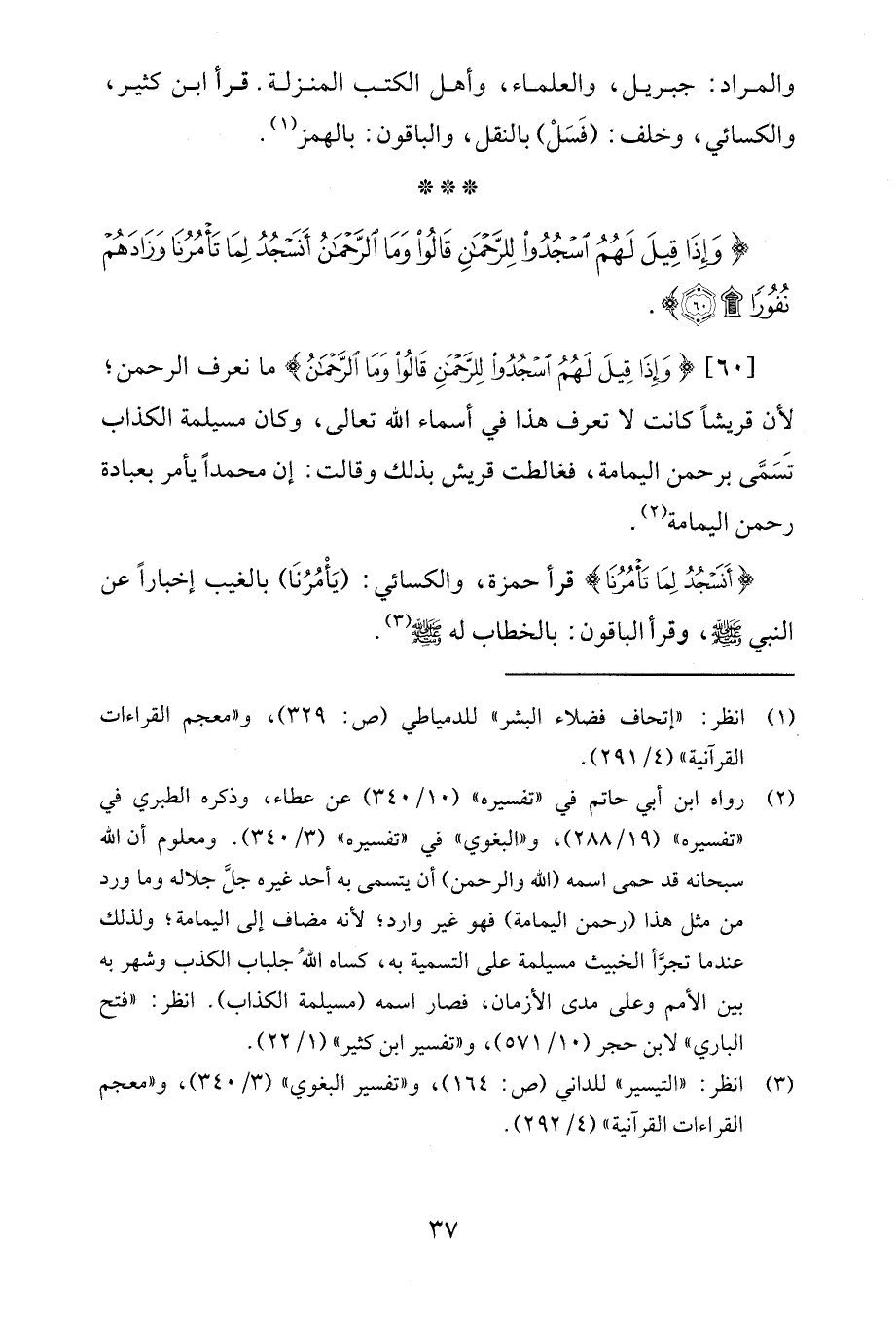 [60] {وَإِذَا قِيلَ لَهُمُ اسْجُدُوا لِلرَّحْمَنِ قَالُوا وَمَا الرَّحْمَنُ} ما نعرف الرحمن؛ لأن قريشًا كانت لا تعرف هذا في أسماء الله تعالى، وكان مسيلمة الكذاب تَسَمَّى برحمن اليمامة، فغالطت قريش بذلك وقالت: إن محمدًا يأمر بعبادة رحمن اليمامة (¬2).