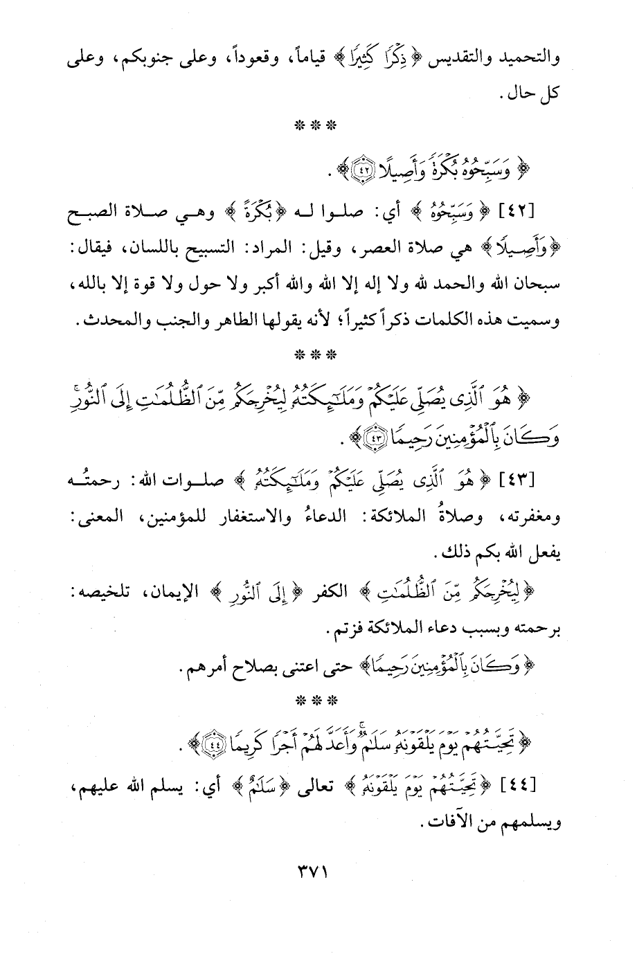 {هُوَ الَّذِي يُصَلِّي عَلَيْكُمْ وَمَلَائِكَتُهُ لِيُخْرِجَكُمْ مِنَ الظُّلُمَاتِ إِلَى النُّورِ وَكَانَ بِالْمُؤْمِنِينَ رَحِيمًا (43)}.