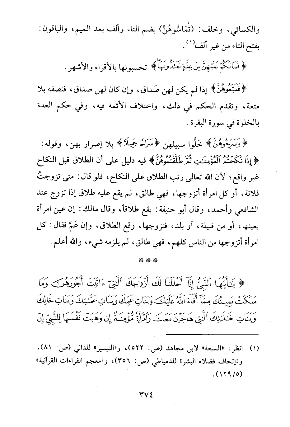 {يَاأَيُّهَا النَّبِيُّ إِنَّا أَحْلَلْنَا لَكَ أَزْوَاجَكَ اللَّاتِي آتَيْتَ أُجُورَهُنَّ وَمَا مَلَكَتْ يَمِينُكَ مِمَّا أَفَاءَ اللَّهُ عَلَيْكَ وَبَنَاتِ عَمِّكَ وَبَنَاتِ عَمَّاتِكَ وَبَنَاتِ خَالِكَ وَبَنَاتِ خَالَاتِكَ اللَّاتِي هَاجَرْنَ مَعَكَ وَامْرَأَةً مُؤْمِنَةً إِنْ وَهَبَتْ نَفْسَهَا لِلنَّبِيِّ إِنْ أَرَادَ النَّبِيُّ أَنْ