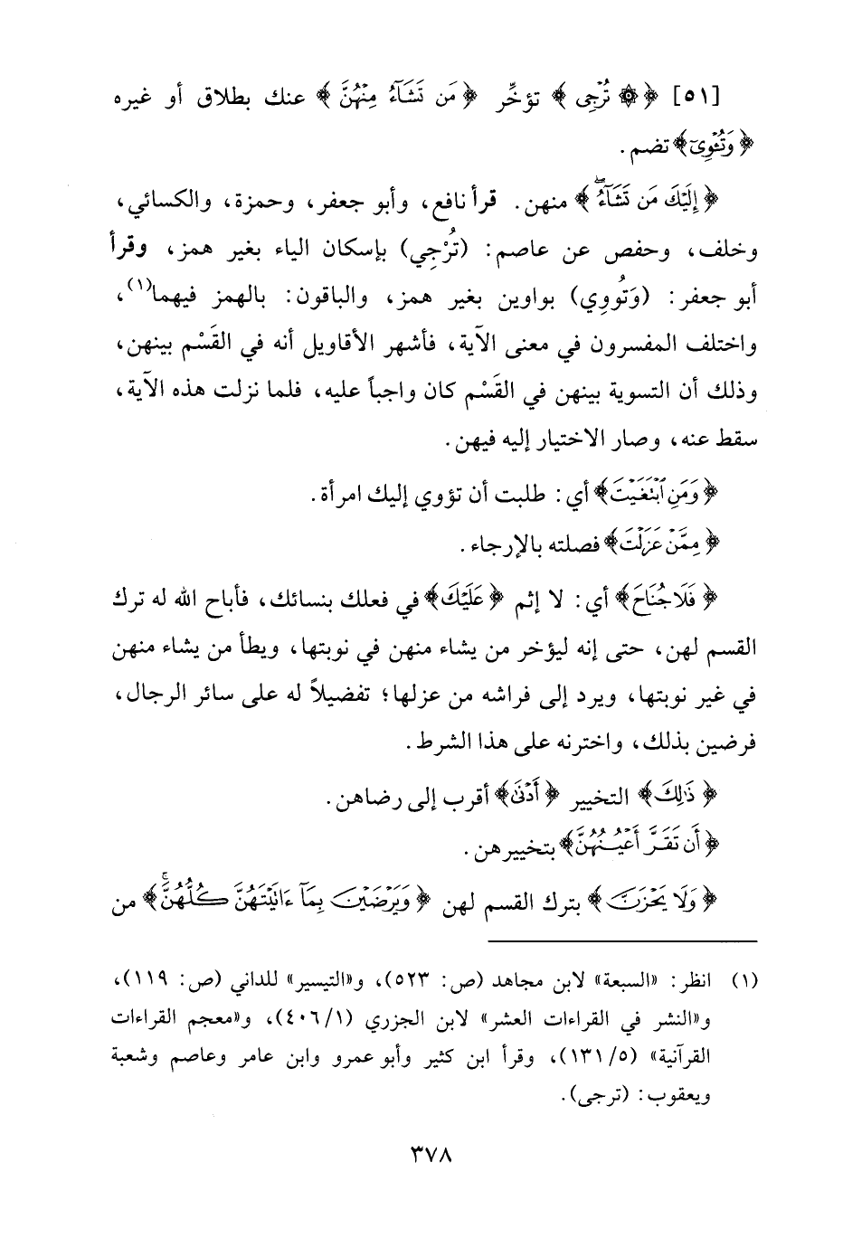 {إِلَيْكَ مَنْ تَشَاءُ} منهن. قرأ نافع، وأبو جعفر، وحمزة، والكسائي، وخلف، وحفص عن عاصم: (تُرْجِي) بإسكان الياء بغير همز، وقرأ أبو جعفر: (وَتُووِي) بواوين بغير همز، والباقون: بالهمز فيهما (¬1)، واختلف المفسرون في معنى الآية، فأشهر الأقاويل أنه في القَسْم بينهن، وذلك أن التسوية بينهن في القَسْم كان واجبًا عليه، فلما نزلت هذه الآية، سقط عنه، وصار الاختيار إليه فيهن.