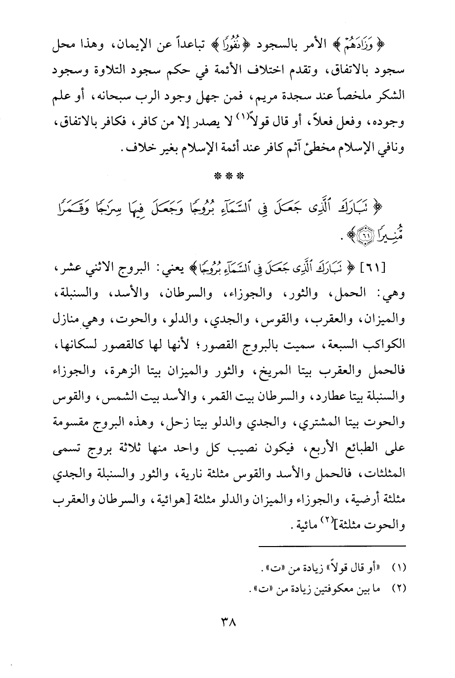 [61] {تَبَارَكَ الَّذِي جَعَلَ فِي السَّمَاءِ بُرُوجًا} يعني: البروج الاثني عشر، وهي: الحمل، والثور، والجوزاء، والسرطان، والأسد، والسنبلة، والميزان، والعقرب، والقوس، والجدي، والدلو، والحوت، وهي منازل الكواكب السبعة، سميت بالبروج المقصور؛ لأنها لها كالقصور لسكانها، فالحمل والعقرب بيتا المريخ، والثور والميزان بيتا الزهرة، والجوزاء والسنبلة بيتا عطارد، والسرطان بيت القمر، والأسد بيت الشمس، والقوس والحوت بيتا المشتري، والجدي والدلو بيتا زحل، وهذه البروج مقسومة على الطبائع الأربع، فيكون نصيب كل واحد منها ثلاثة بروج تسمى المثلثات، فالحمل والأسد والقوس مثلثة نارية، والثور والسنبلة والجدي مثلثة أرضية، والجوزاء والميزان والدلو مثلثة [هوائية، والسرطان والعقرب والحوت مثلثة] (¬2) مائية.