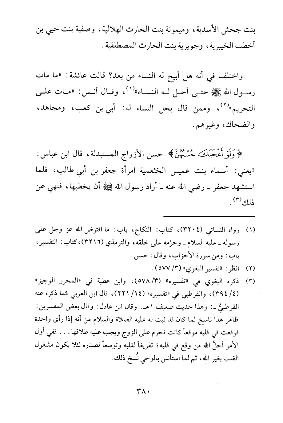 (¬3) ذكره البغوي في "تفسيره" (3/ 578)، وابن عطية في "المحرر الوجيز" (4/ 394)، والقرطبي في "تفسيره" (14/ 221)، قال ابن العربي كما ذكره عنه القرطبيُّ-: وهذا حديث ضعيف 1 هـ. وقال ابن عادل: وقال بعض المفسرين: ظاهر هذا ناسخ لما كان قد ثبت له عليه الصلاة والسلام من أنه إذا رأى واحدة فوقعت في قلبه موقعًا كانت تحرم على الزوج ويجب عليه طلاقها ... ففي أول الأمر أحلَّ الله من وقع في قلبه؛ تفريغًا لقلبه وتوسعًا لصدره لئلا يكون مشغول القلب بغير الله، ثم لما استأنس بالوحي نُسخ ذلك.