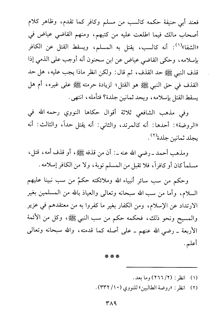 فعند أبي حنيفة حكمه كالسب من مسلم وكافر كما تقدم، وظاهر كلام أصحاب مالك فيما اطلعت عليه من كتبهم، ومنهم القاضي عياض في "الشفا" (¬1): أنه كالسب، يقتل به المسلم، ويسقط القتل عن الكافر بإسلامه، وحكى القاضي عياض عن ابن سحنون أنه أوجب على الذمي إذا قذف النبي - صلى الله عليه وسلم - حد القذف، ثم قال: ولكن انظر ماذا يجب عليه، هل حد القذف في حق النبي - صلى الله عليه وسلم - هو القتل؛ لزيادة حرمته - صلى الله عليه وسلم - على غيره، أم هل يسقط القتل بإسلامه، ويحد ثمانين جلدة؟ فتأمله، انتهى.