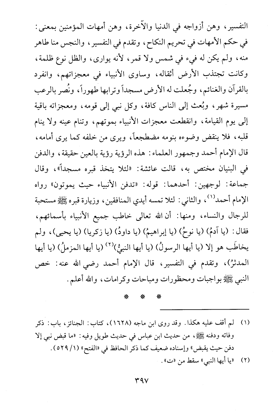 التفسير، وهن أزواجه في الدنيا والآخرة، وهن أمهات المؤمنين بمعنى: في حكم الأمهات في تحريم النكاح، وتقدم في التفسير، والنجس منا طاهر منه، ولم يكن له فيء في شمس ولا قمر، لأنه يوارى، والظل نوع ظلمة، وكانت تجتذب الأرض أثقاله، وساوى الأنبياء في معجزاتهم، وانفرد بالقرآن والغنائم، وجُعلت له الأرض مسجدًا وترابها طهورًا، ونُصر بالرعب مسيرة شهر، وبُعث إلى الناس كافة، وكل نبي إلى قومه، ومعجزاته باقية إلى يوم القيامة، وانقطعت معجزات الأنبياء بموتهم، وتنام عينه ولا ينام قلبه، فلا ينقض وضوءه بنومه مضطجعًا، ويرى من خلفه كما يرى أمامه، قال الإمام أحمد وجمهور العلماء: هذه الرؤية رؤية بالعين حقيقة، والدفن في البنيان مختص به، قالت عائشة: "لئلا يتخذ قبره مسجدًا"، وقال جماعة: لوجهين: أحدهما: قوله: "تدفن الأنبياء حيث يموتون" رواه الإمام أحمد (¬1)، والثاني: لئلا تمسه أيدي المنافقين، وزيارة قبره - صلى الله عليه وسلم - مستحبة للرجال والنساء، ومنها: أن الله تعالى خاطب جميع الأنبياء بأسمائهم، فقال: (يا آدمُ) (يا نوحُ) (يا إبراهيمُ) (يا داودُ) (يا زكريا) (يا يحيى)، ولم يخاطَب هو إلا (يا أيها الرسولُ) (يا أيها النبيُّ) (¬2) (يا أيها المزملُ) (يا أيها المدثرُ)، وتقدم في التفسير، قال الإمام أحمد رضي الله عنه: خص النبي - صلى الله عليه وسلم - بواجبات ومحظورات ومباحات وكرامات، والله أعلم.