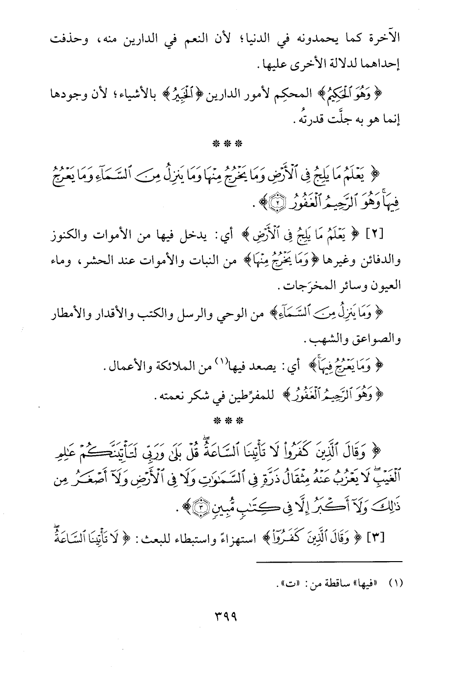 {وَقَالَ الَّذِينَ كَفَرُوا لَا تَأْتِينَا السَّاعَةُ قُلْ بَلَى وَرَبِّي لَتَأْتِيَنَّكُمْ عَالِمِ الْغَيْبِ لَا يَعْزُبُ عَنْهُ مِثْقَالُ ذَرَّةٍ فِي السَّمَاوَاتِ وَلَا فِي الْأَرْضِ وَلَا أَصْغَرُ مِنْ ذَلِكَ وَلَا أَكْبَرُ إِلَّا فِي كِتَابٍ مُبِينٍ (3)}.