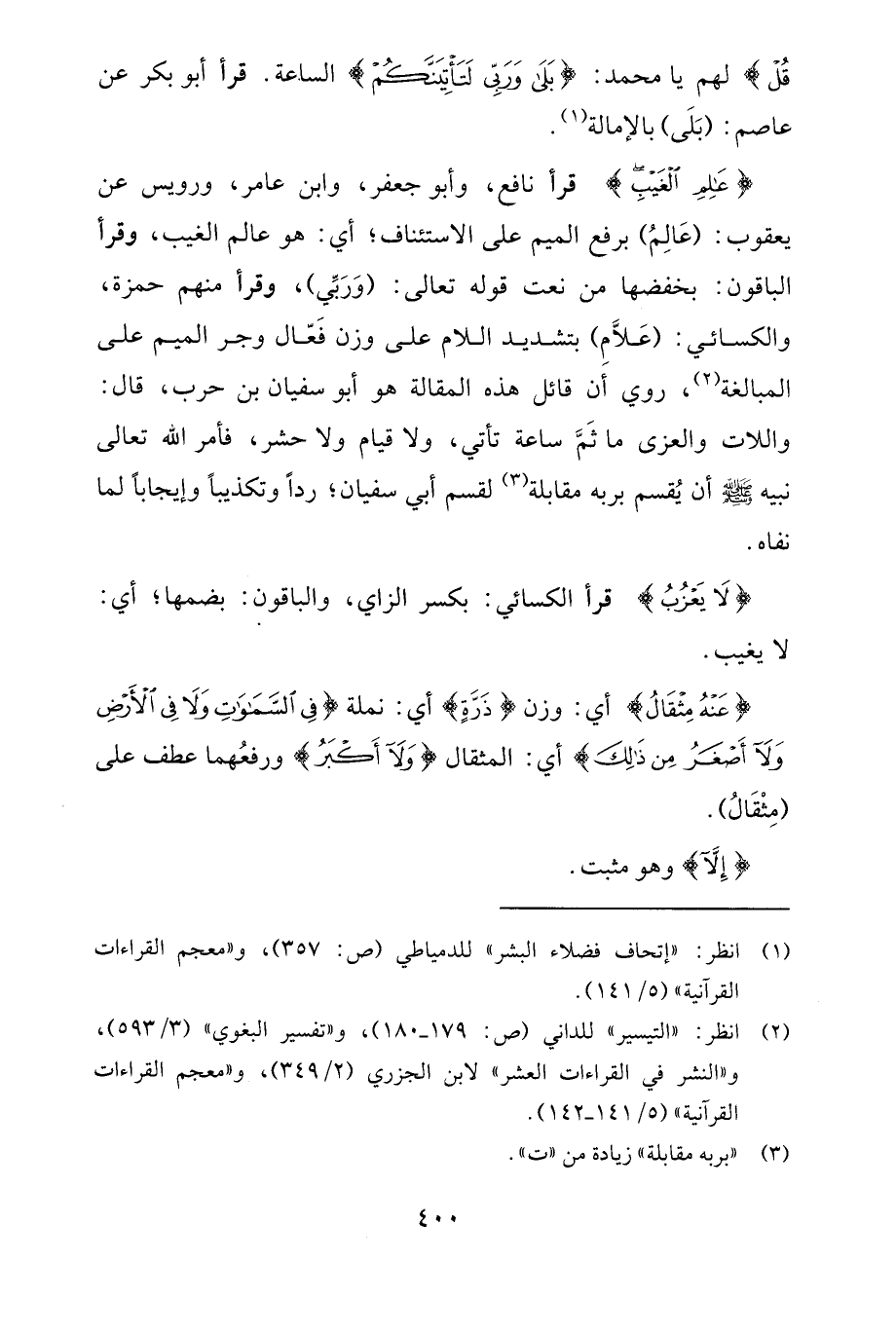 {عَالِمِ الْغَيْبِ} قرأ نافع، وأبو جعفر، وابن عامر، ورويس عن يعقوب: (عَالِمُ) برفع الميم على الاستئناف؛ أي: هو عالم الغيب، وقرأ الباقون: بخفضها من نعت قوله تعالى: (وَرَبِّي)، وقرأ منهم حمزة، والكسائي: (عَلَّامِ) بتشديد اللام على وزن فَعّال وجر الميم على المبالغة (¬2)، روي أن قائل هذه المقالة هو أبو سفيان بن حرب، قال: واللات والعزى ما ثَمَّ ساعة تأتي، ولا قيام ولا حشر، فأمر الله تعالى نبيه - صلى الله عليه وسلم - أن يُقسم بربه مقابلة (¬3) لقسم أبي سفيان؛ ردًّا وتكذيبًا وإيجابًا لما نفاه.