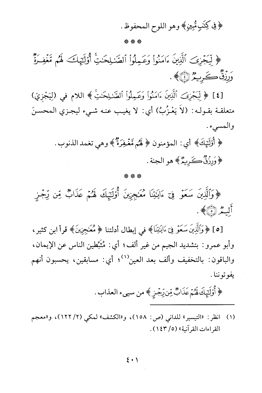 [4] {لِيَجْزِيَ الَّذِينَ آمَنُوا وَعَمِلُوا الصَّالِحَاتِ} اللام في (لِيَجْزِيَ) متعلقة بقوله: (لاَ يَعْزُبُ) أي: لا يغيب عنه شيء ليجزي المحسنَ والمسيء.