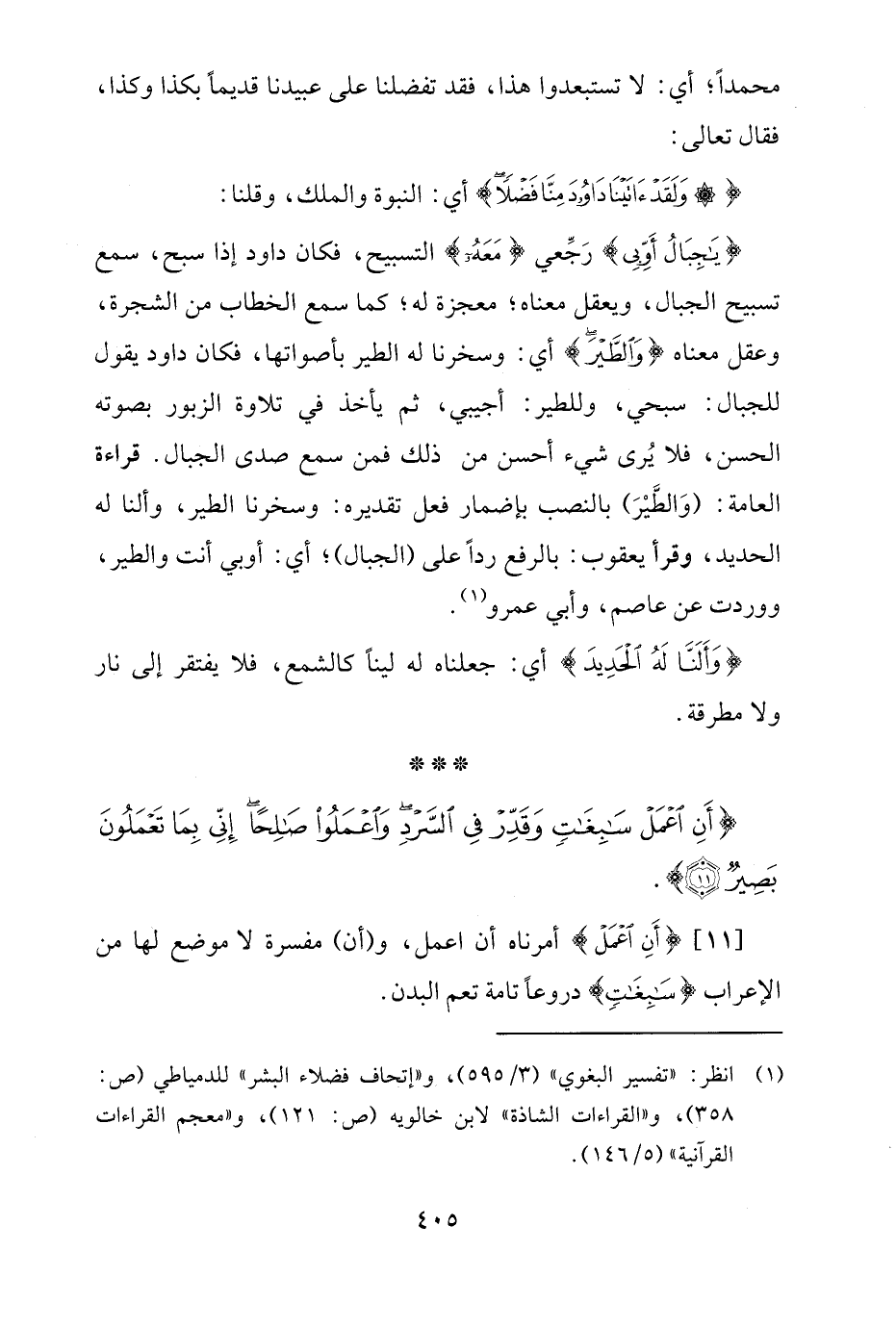{يَاجِبَالُ أَوِّبِي} رَجِّعي {مَعَهُ} التسبيح، فكان داود إذا سبح، سمع تسبيح الجبال، ويعقل معناه؛ معجزة له؛ كما سمع الخطاب من الشجرة، وعقل معناه {وَالطَّيْرَ} أي: وسخرنا له الطير بأصواتها، فكان داود يقول للجبال: سبحي، وللطير: أجيبي، ثم يأخذ في تلاوة الزبور بصوته الحسن، فلا يُرى شيء أحسن من ذلك فمن سمع صدى الجبال. قراءة العامة: (وَالطَّيْرَ) بالنصب بإضمار فعل تقديره: وسخرنا الطير، وألنا له الحديد، وقرأ يعقوب: بالرفع ردًّا على (الجبال)؛ أي: أوبي أنت والطير، ووردت عن عاصم، وأبي عمرو (¬1).