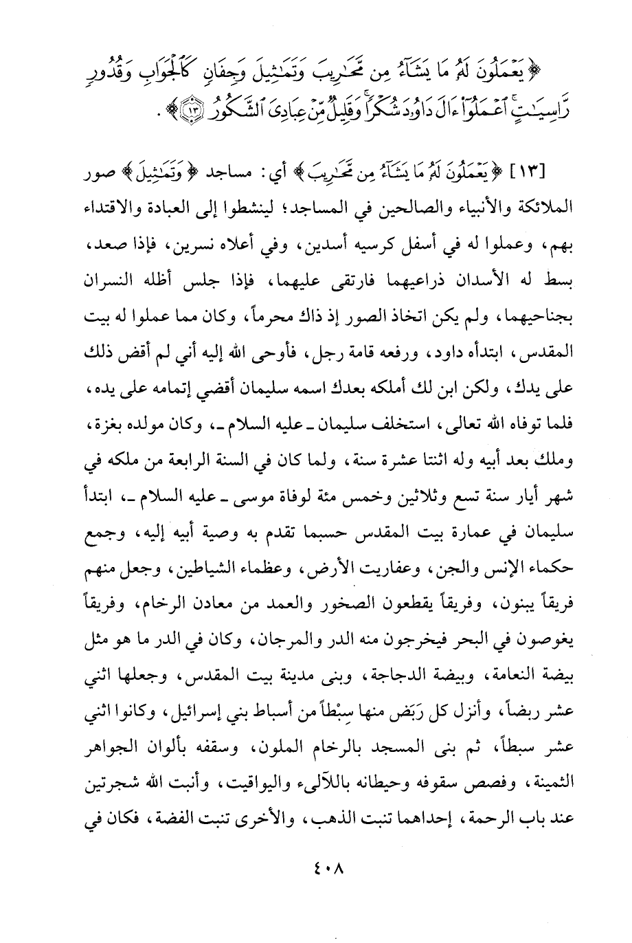 [13] {يَعْمَلُونَ لَهُ مَا يَشَاءُ مِنْ مَحَارِيبَ} أي: مساجد {وَتَمَاثِيلَ} صور الملائكة والأنبياء والصالحين في المساجد؛ لينشطوا إلى العبادة والاقتداء بهم، وعملوا له في أسفل كرسيه أسدين، وفي أعلاه نسرين، فإذا صعد، بسط له الأسدان ذراعيهما فارتقى عليهما، فإذا جلس أظله النسران بجناحيهما، ولم يكن اتخاذ الصور إذ ذاك محرمًا، وكان مما عملوا له بيت المقدس، ابتدأه داود، ورفعه قامة رجل، فأوحى الله إليه أني لم أقض ذلك على يدك، ولكن ابن لك أملكه بعدك اسمه سليمان أقضي إتمامه على يده، فلما توفاه الله تعالى، استخلف سليمان -عليه السلام-، وكان مولده بغزة، وملك بعد أبيه وله اثنتا عشرة سنة، ولما كان في السنة الرابعة من ملكه في شهر أيار سنة تسع وثلاثين وخمس مئة لوفاة موسى -عليه السلام-، ابتدأ سليمان في عمارة بيت المقدس حسبما تقدم به وصية أبيه إليه، وجمع حكماء الإنس والجن، وعفاريت الأرض، وعظماء الشياطين، وجعل منهم فريقًا يبنون، وفريقًا يقطعون الصخور والعمد من معادن الرخام، وفريقًا يغوصون في البحر فيخرجون منه الدر والمرجان، وكان في الدر ما هو مثل بيضة النعامة، وبيضة الدجاجة، وبنى مدينة بيت المقدس، وجعلها اثني عشر ربضًا، وأنزل كل رَبَض منها سِبْطًا من أسباط بني إسرائيل، وكانوا اثني عشر سبطًا، ثم بنى المسجد بالرخام الملون، وسقفه بألوان الجواهر الثمينة، وفصص سقوفه وحيطانه باللآلئ واليواقيت، وأنبت الله شجرتين عند باب الرحمة، إحداهما تنبت الذهب، والأخرى تنبت الفضة، فكان في