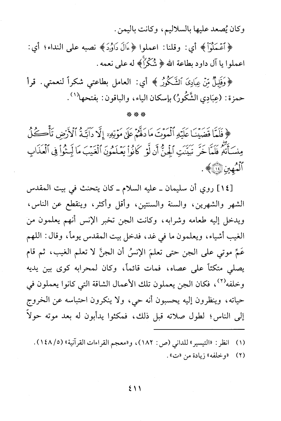 [14] روي أن سليمان -عليه السلام- كان يتحنث في بيت المقدس الشهر والشهرين، والسنة والسنتين، وأقل وأكثر، وينقطع عن الناس، ويدخل إليه طعامه وشرابه، وكانت الجن تخبر الإنس أنهم يعلمون من الغيب أشياء، ويعلمون ما في غد، فدخل بيت المقدس يومًا، وقال: اللهم عَمِّ موتي على الجن حتى تعلمَ الإنسُ أن الجنَّ لا تعلم الغيب، ثم قام يصلي متكئًا على عصاه، فمات قائمًا، وكان لمحرابه كوى بين يديه وخلفه (¬2)، فكان الجن يعملون تلك الأعمال الشاقة التي كانوا يعملون في حياته، وينظرون إليه يحسبون أنه حي، ولا ينكرون احتباسه عن الخروج إلى الناس؛ لطول صلاته قبل ذلك، فمكثوا يدأبون له بعد موته حولًا