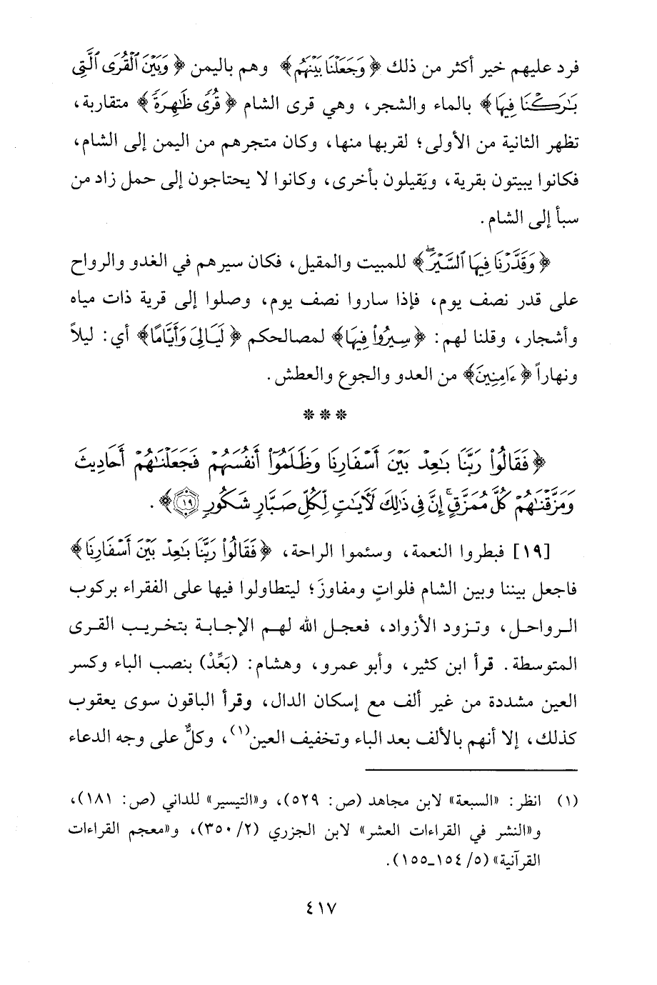 [19] فبطروا النعمة، وسئموا الراحة، {فَقَالُوا رَبَّنَا بَاعِدْ بَيْنَ أَسْفَارِنَا} فاجعل بيننا وبين الشام فلواتٍ ومفاوزَ؛ ليتطاولوا فيها على الفقراء بركوب الرواحل، وتزود الأزواد، فعجل الله لهم الإجابة بتخريب القرى المتوسطة. قرأ ابن كثير، وأبو عمرو، وهشام: (بَعِّدْ) بنصب الباء وكسر العين مشددة من غير ألف مع إسكان الدال، وقرأ الباقون سوى يعقوب كذلك، إلا أنهم بالألف بعد الباء وتخفيف العين (¬1)، وكلٌّ على وجه الدعاء