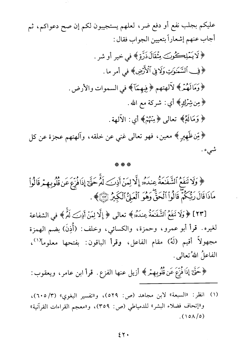 {وَلَا تَنْفَعُ الشَّفَاعَةُ عِنْدَهُ إِلَّا لِمَنْ أَذِنَ لَهُ حَتَّى إِذَا فُزِّعَ عَنْ قُلُوبِهِمْ قَالُوا مَاذَا قَالَ رَبُّكُمْ قَالُوا الْحَقَّ وَهُوَ الْعَلِيُّ الْكَبِيرُ (23)}.